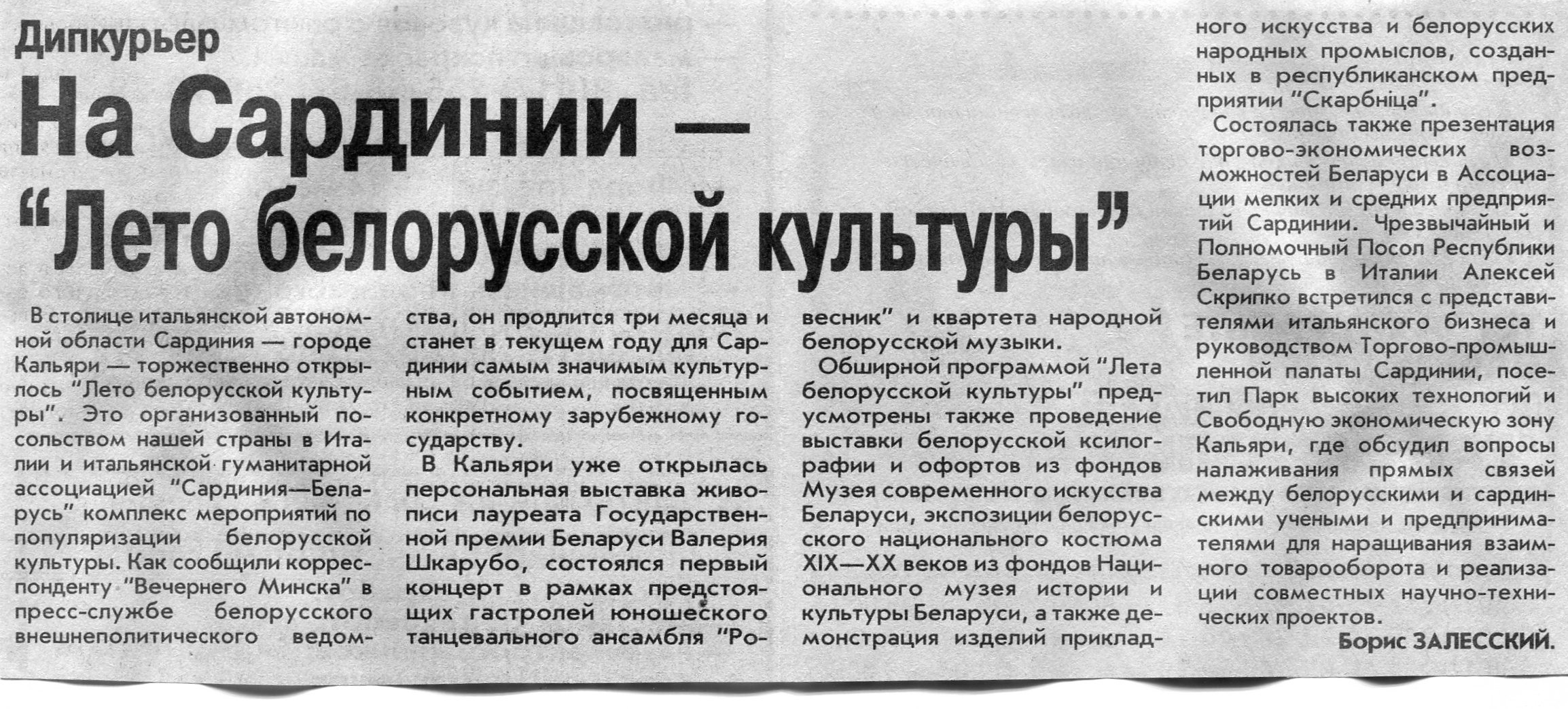 Залесский, Б. На Сардинии - "Лето белорусской культуры" / Б. Залесский // Вечерний Минск. - 2003. - 18 июл.