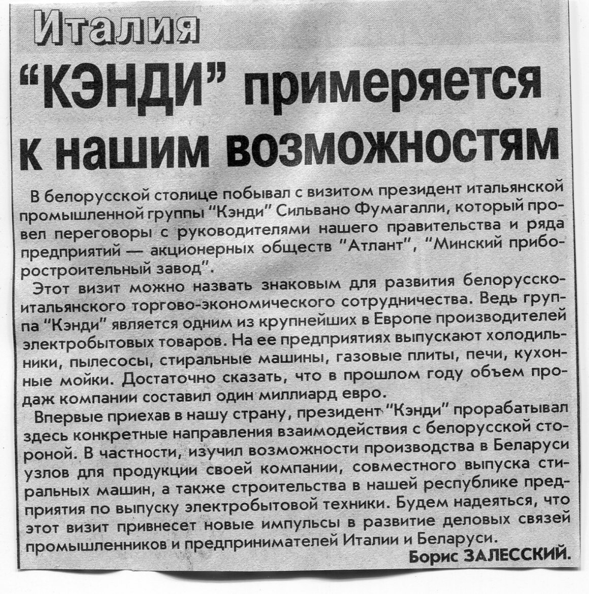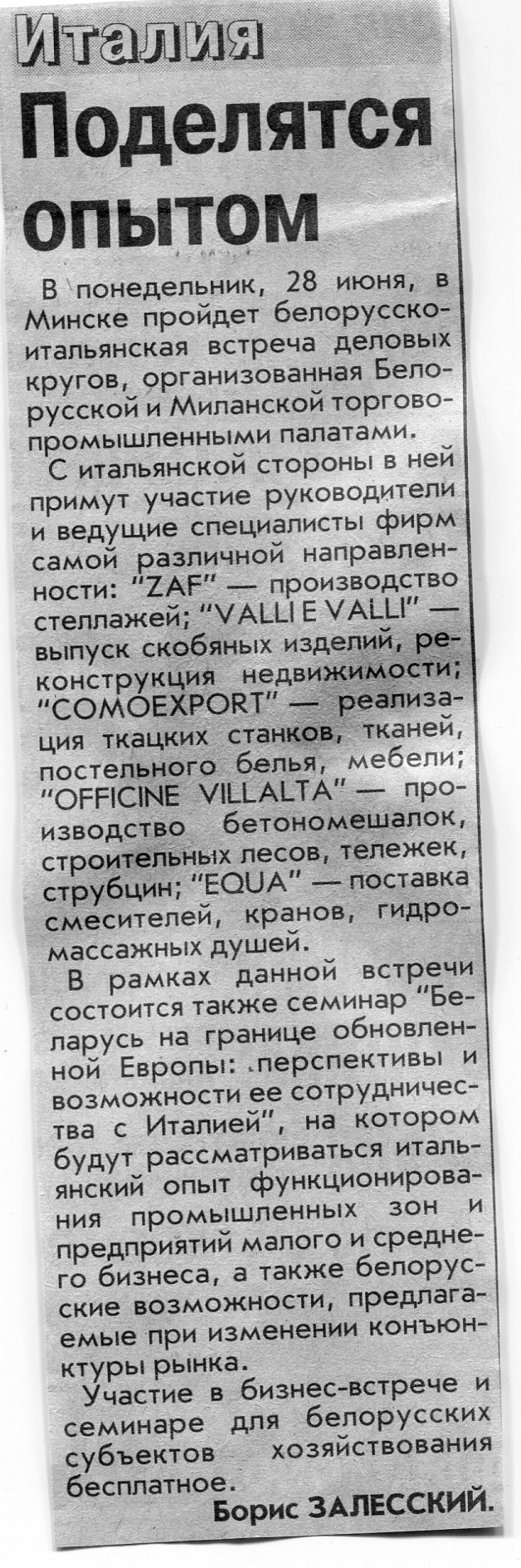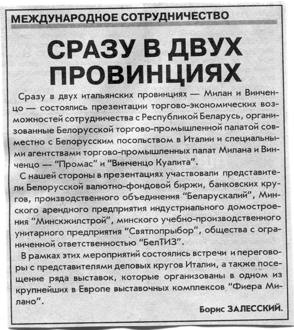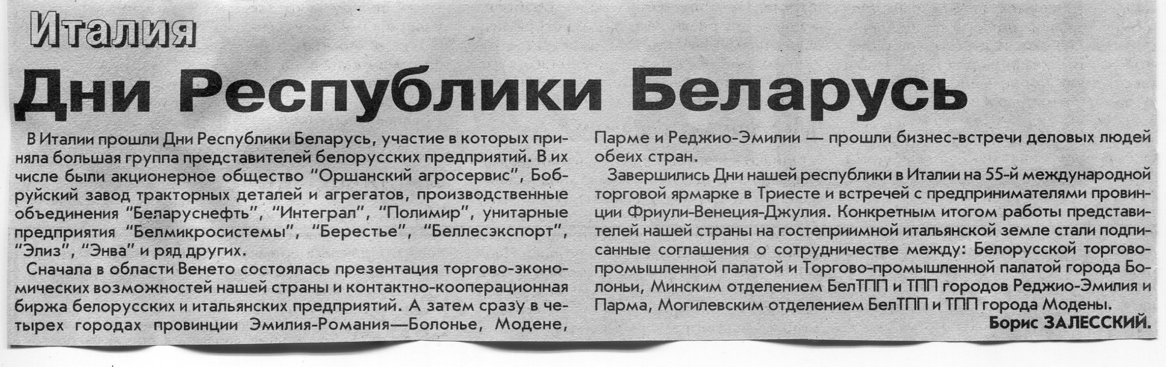Залесский, Б. Есть у Советского района побратим в Италии / Б. Залесский // Вечерний Минск. - 2003. - 29 мая.