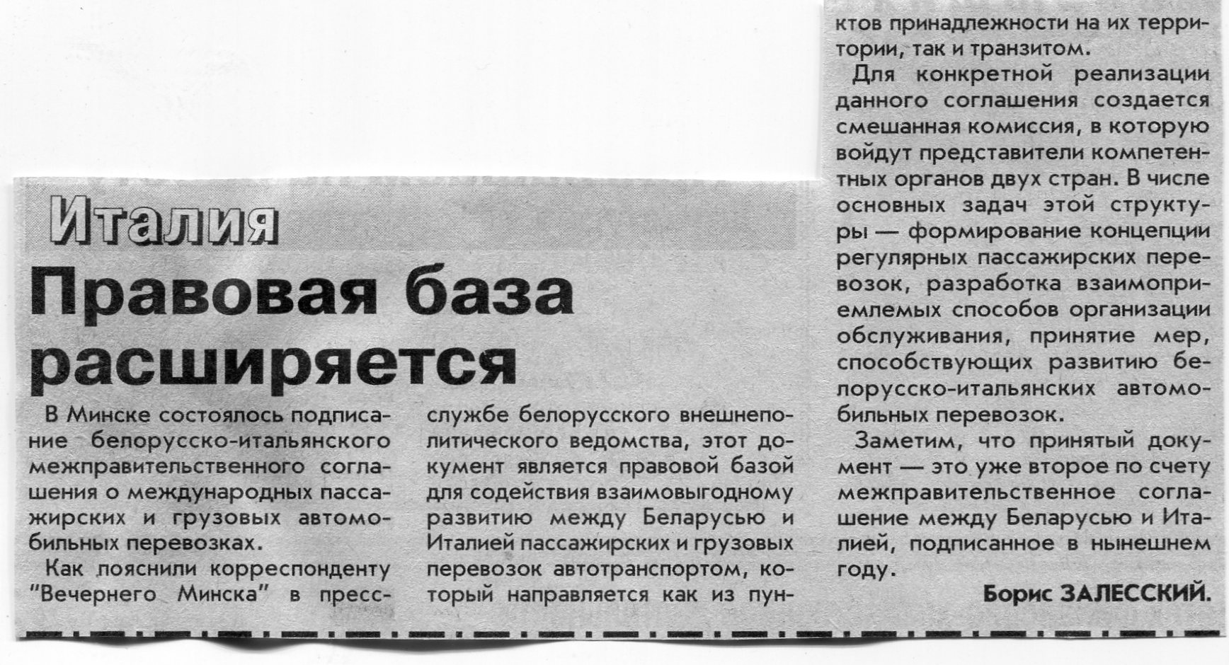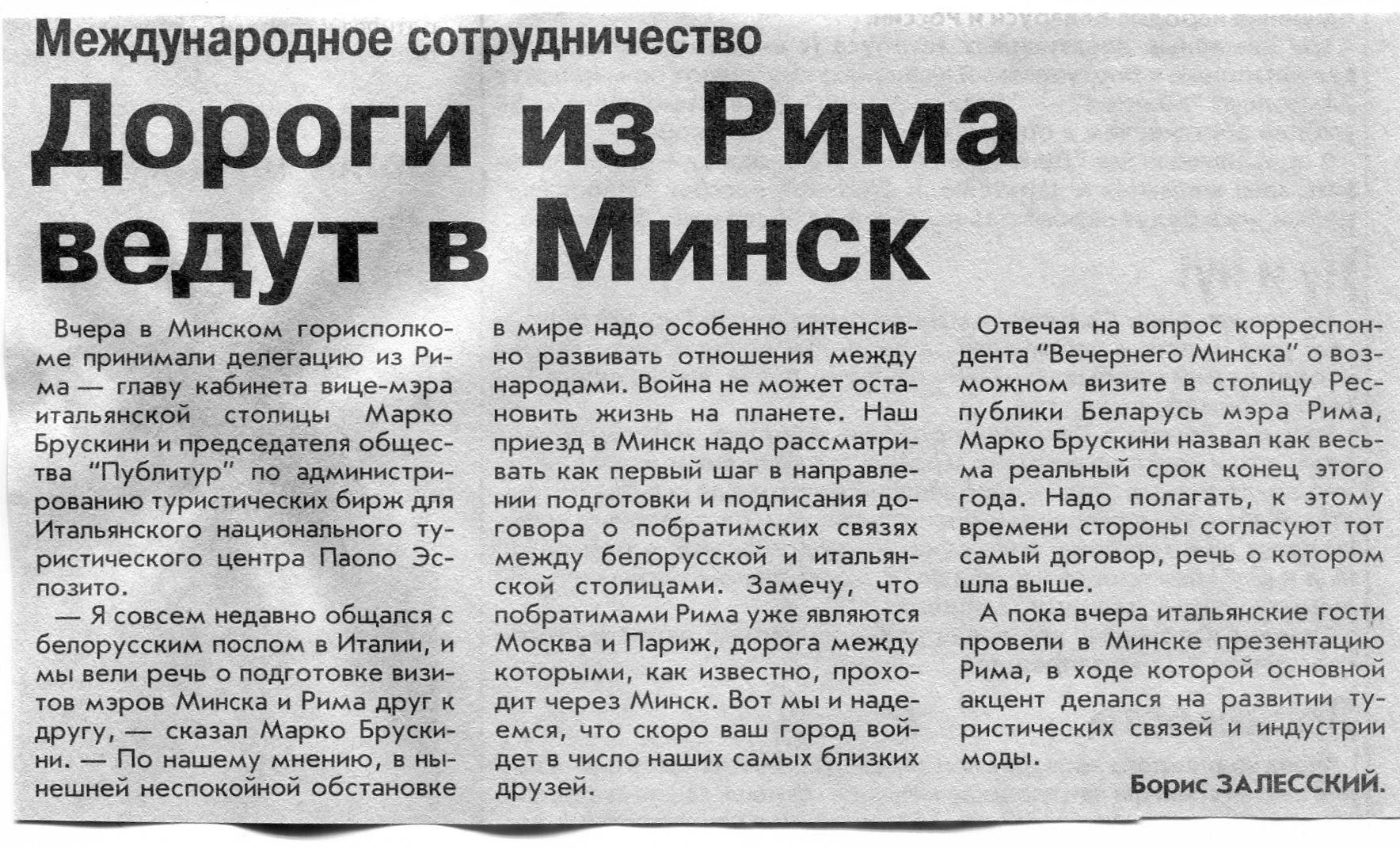 Залесский, Б. Дороги из Рима ведут в Минск / Б. Залесский // Вечерний Минск. - 2003. - 1 апр.