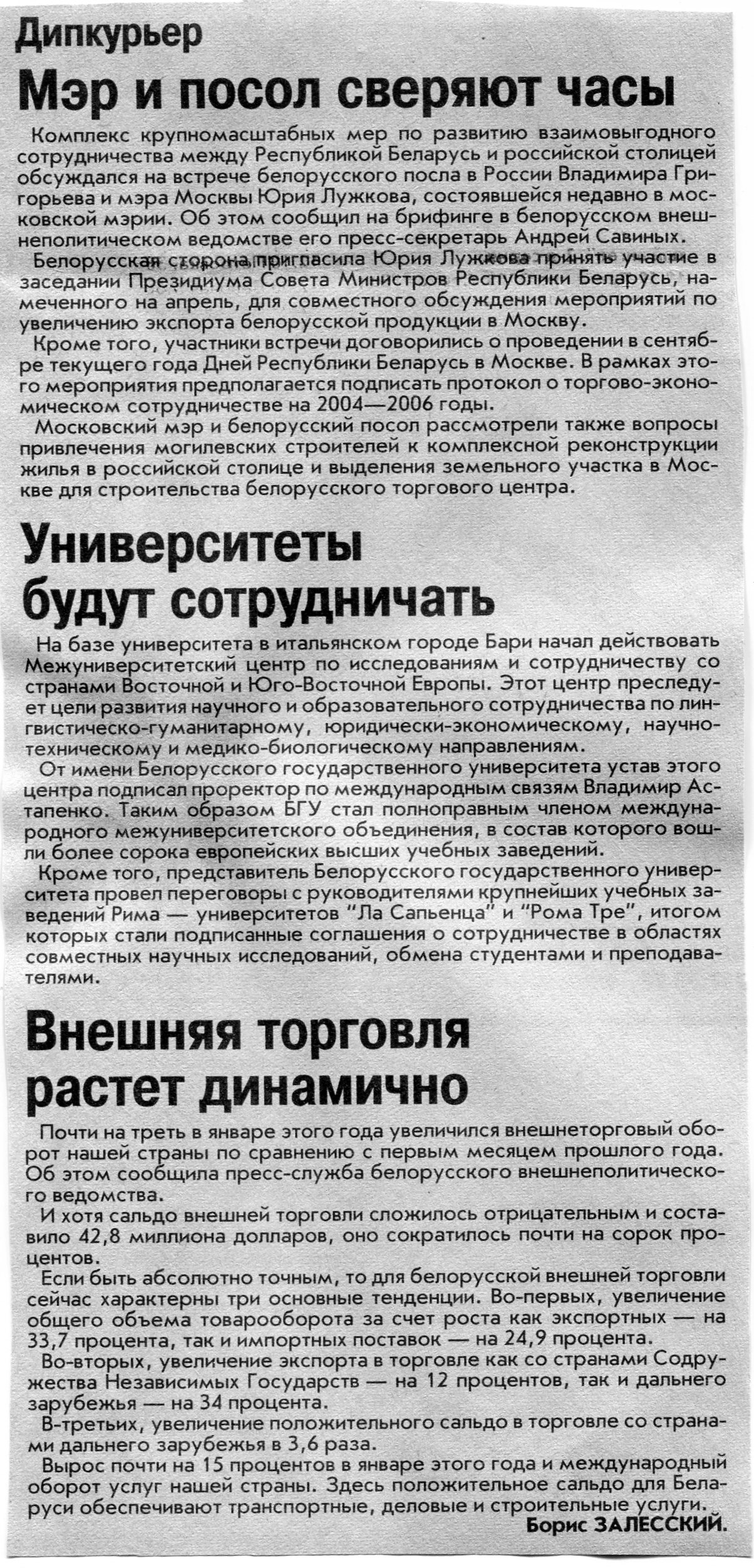 Залесский, Б.Университеты будут сотрудничать / Б. Залесский // Вечерний Минск. - 2003. - 28 мар.
