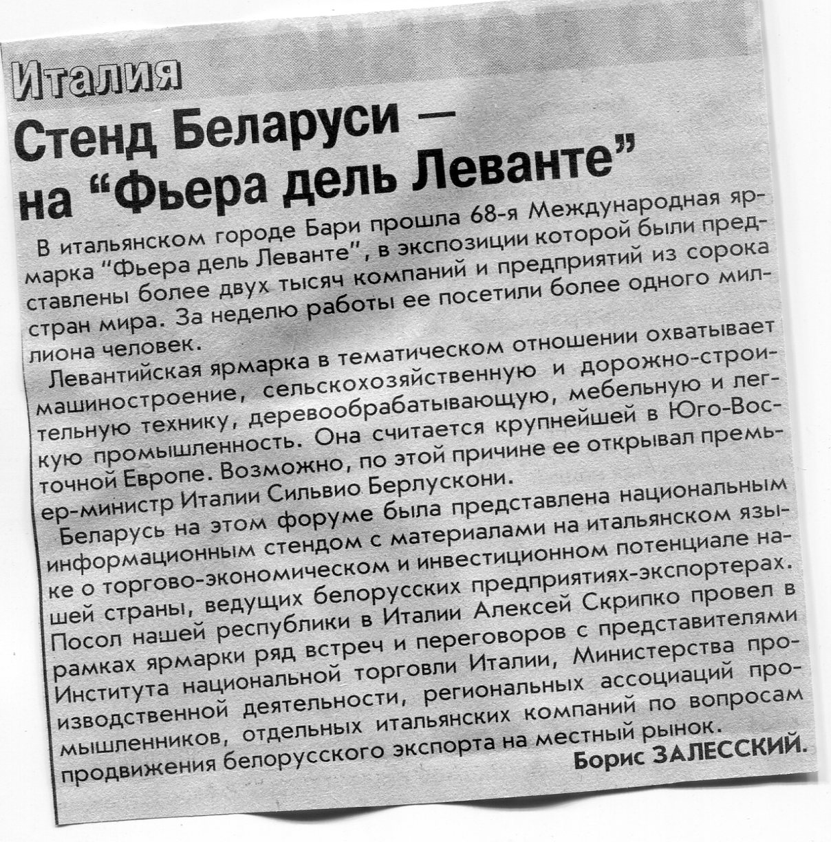 Залесский, Б. Стенд Беларуси - на "Фьера дель Леванте" / Б. Залесский // Вечерний Минск. - 2004. - 13 окт.