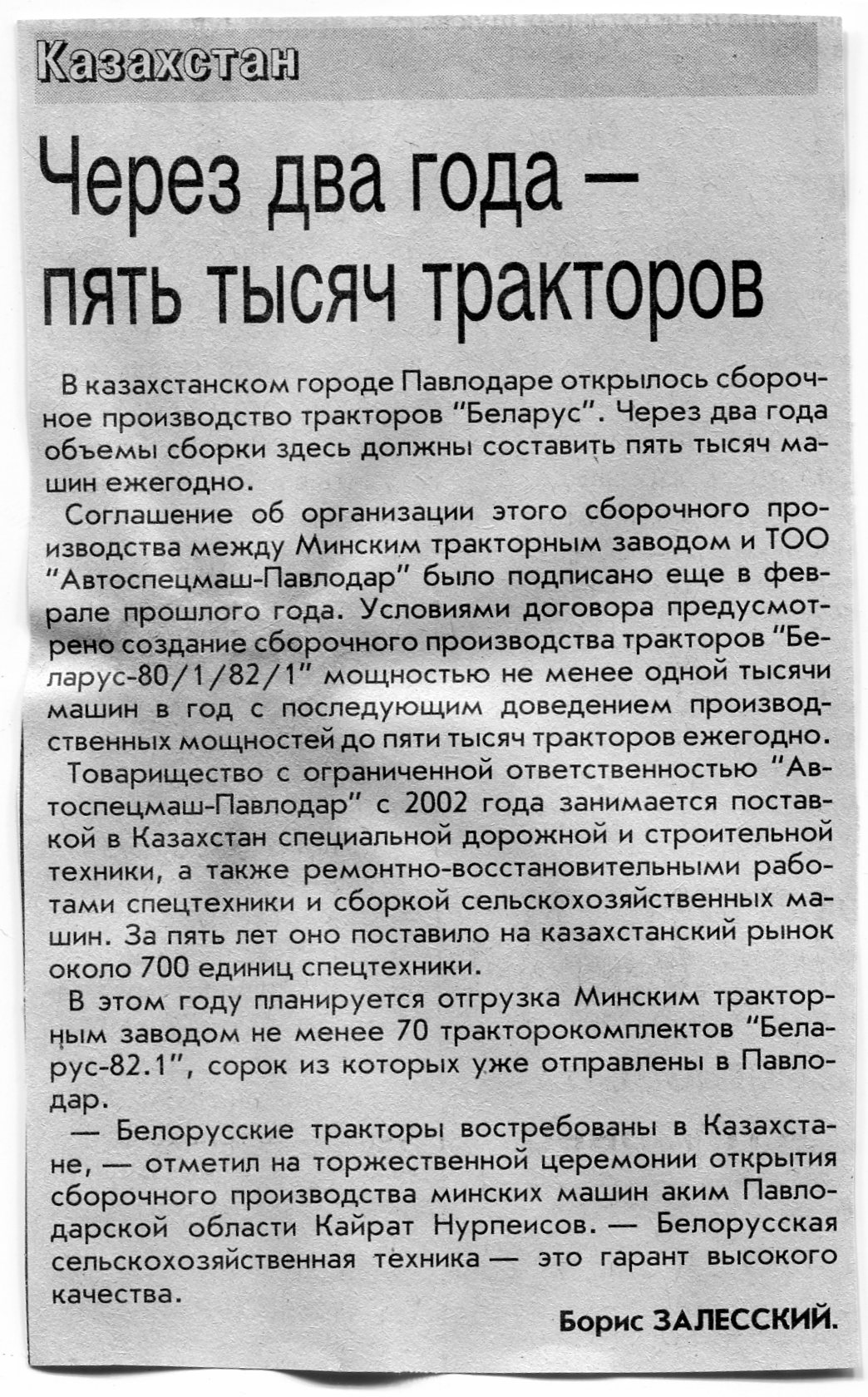 Залесский, Б. Через два года - пять тысяч тракторов / Б. Залесский // Вечерний Минск. - 2007. - 21 сент.