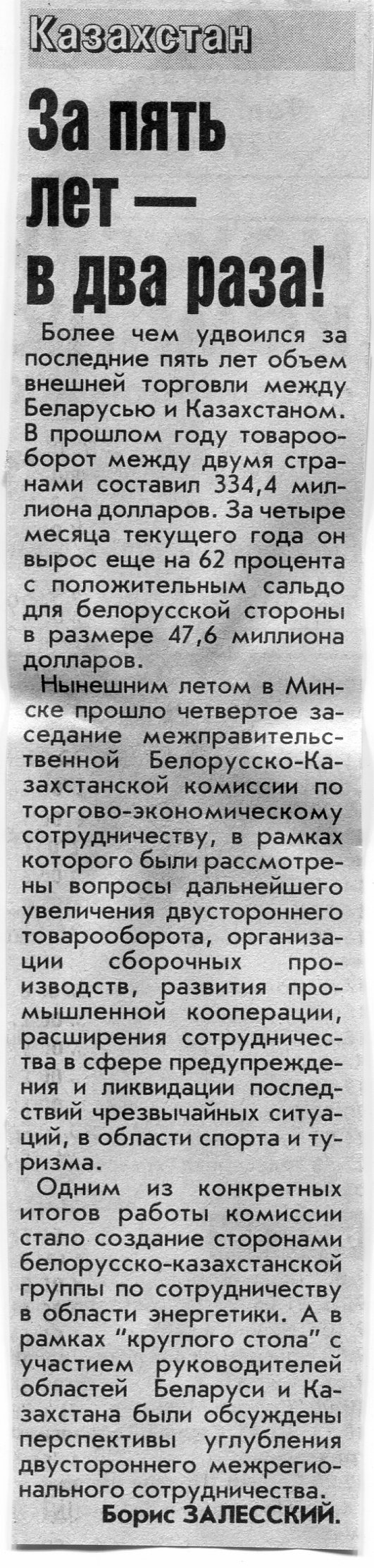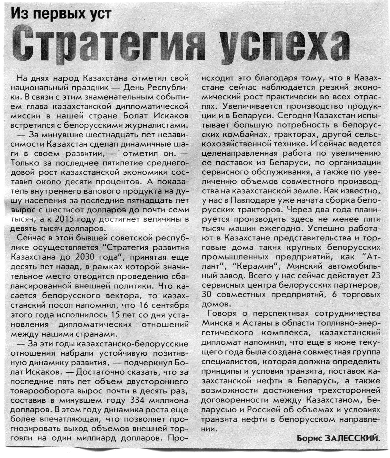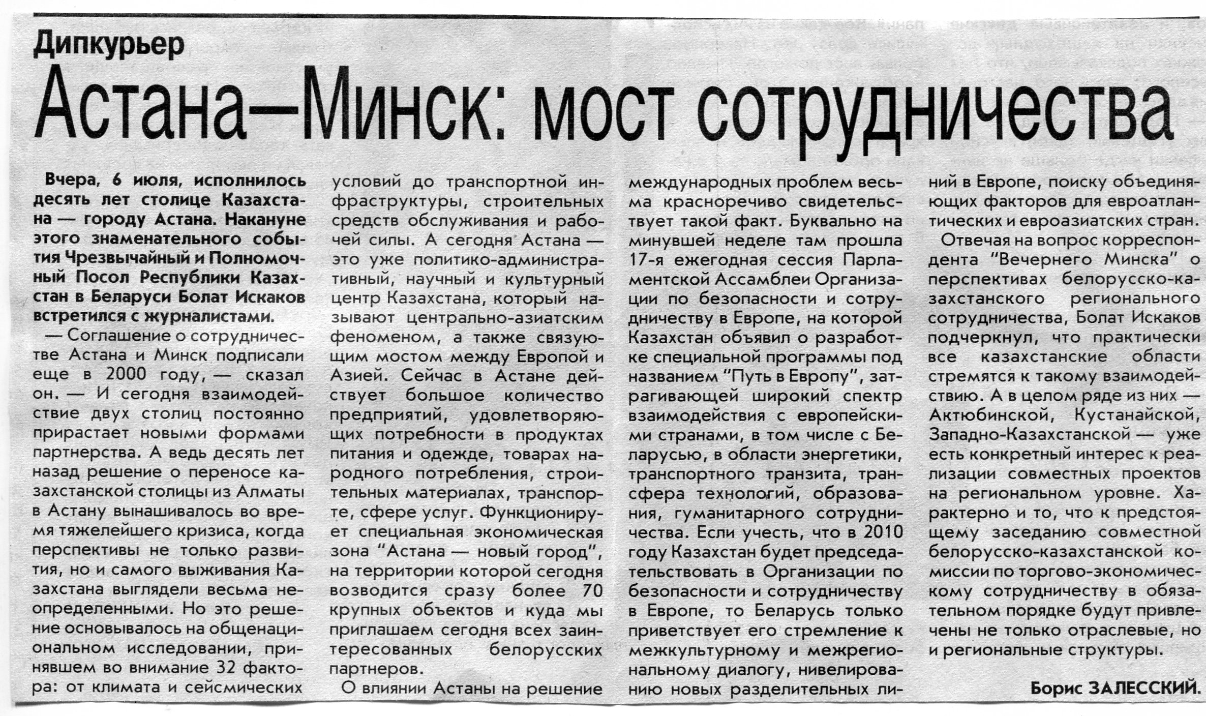 Залесский, Б. Астана - Минск: мост сотрудничества / Б. Залесский // Вечерний Минск. - 2008. - 7 июл.