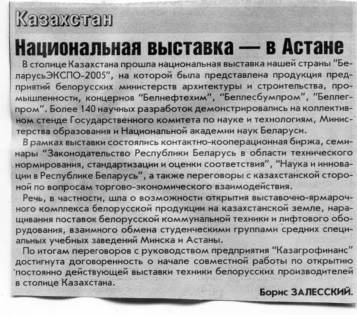 Залесский, Б. Национальная выставка - в Астане / Б. Залесский // Вечерний Минск. - 2005. - 28 нояб.