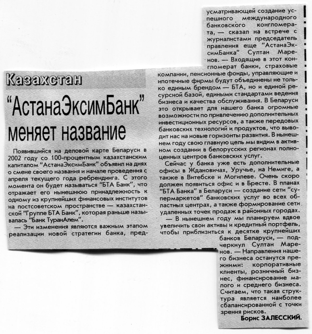 Залесский, Б. "АстанаЭксимБанк" меняет название / Б. Залесский // Вечерний Минск. - 2008. - 7 апр.