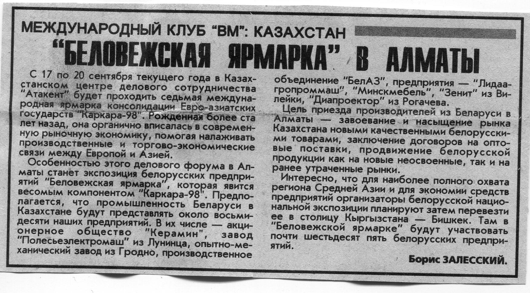 Залесский, Б. "Беловежская ярмарка" в Алматы / Б. Залесский // Вечерний Минск. - 1998. - 26 авг.