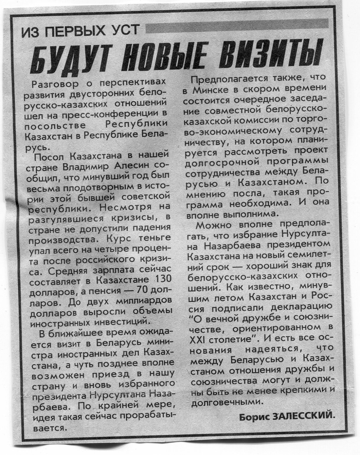 Залесский, Б. Будут новые визиты / Б. Залесский // Вечерний Минск. - 1999. - 15 янв.