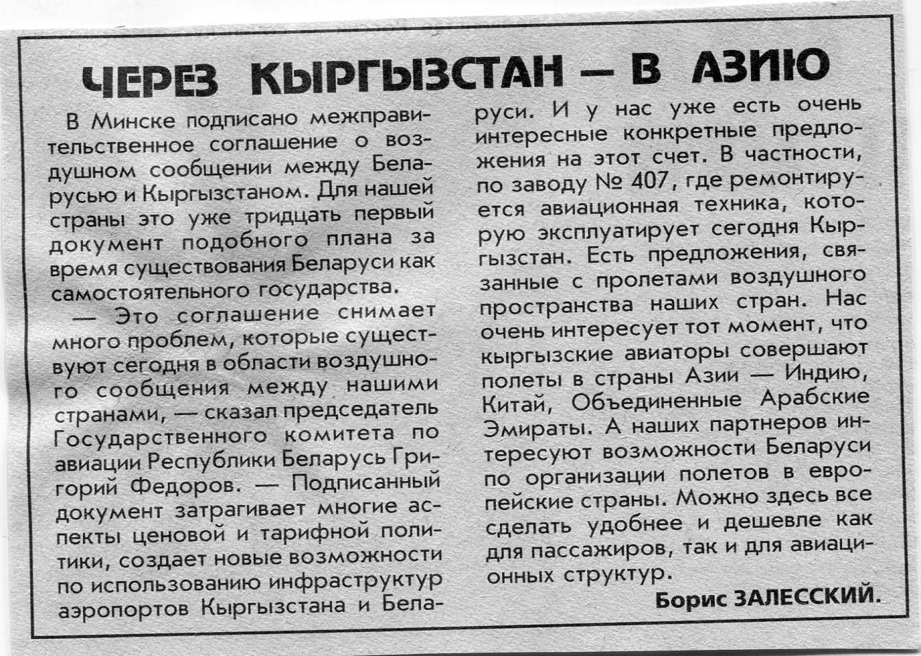 Залесский, Б. Через Кыргызстан - в Азию / Б. Залесский // Вечерний Минск. - 2000. - 8 февр.