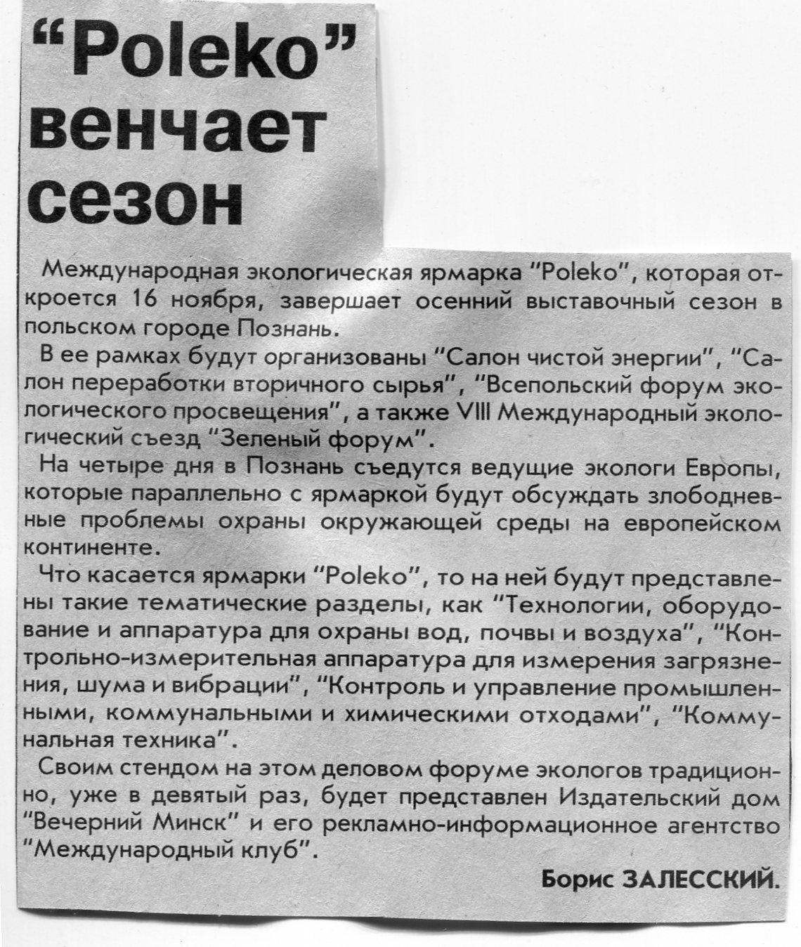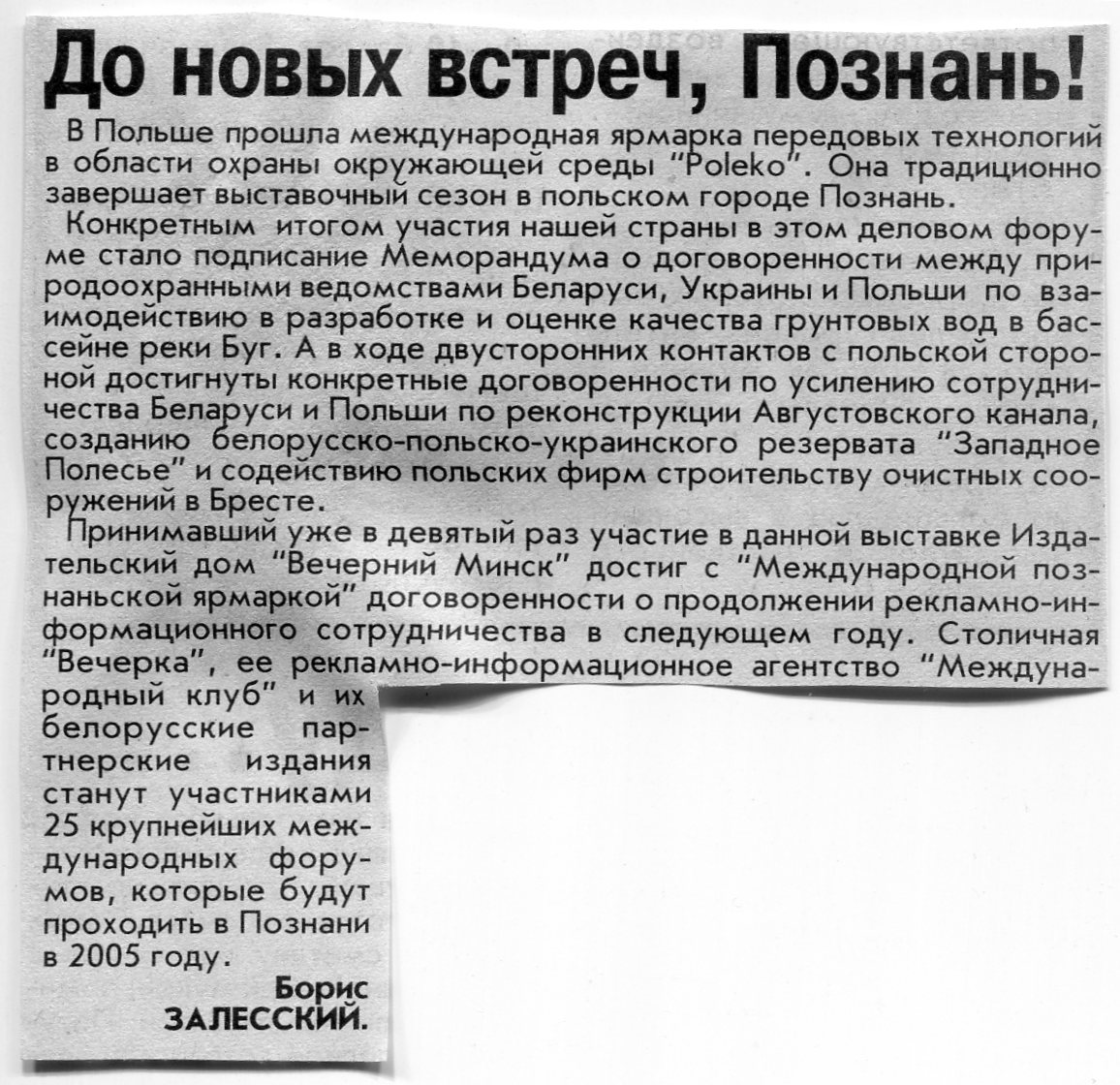 Залесский, Б. До новых встреч, Познань! / Б. Залесский // Вечерний Минск. - 2004. - 25 нояб.