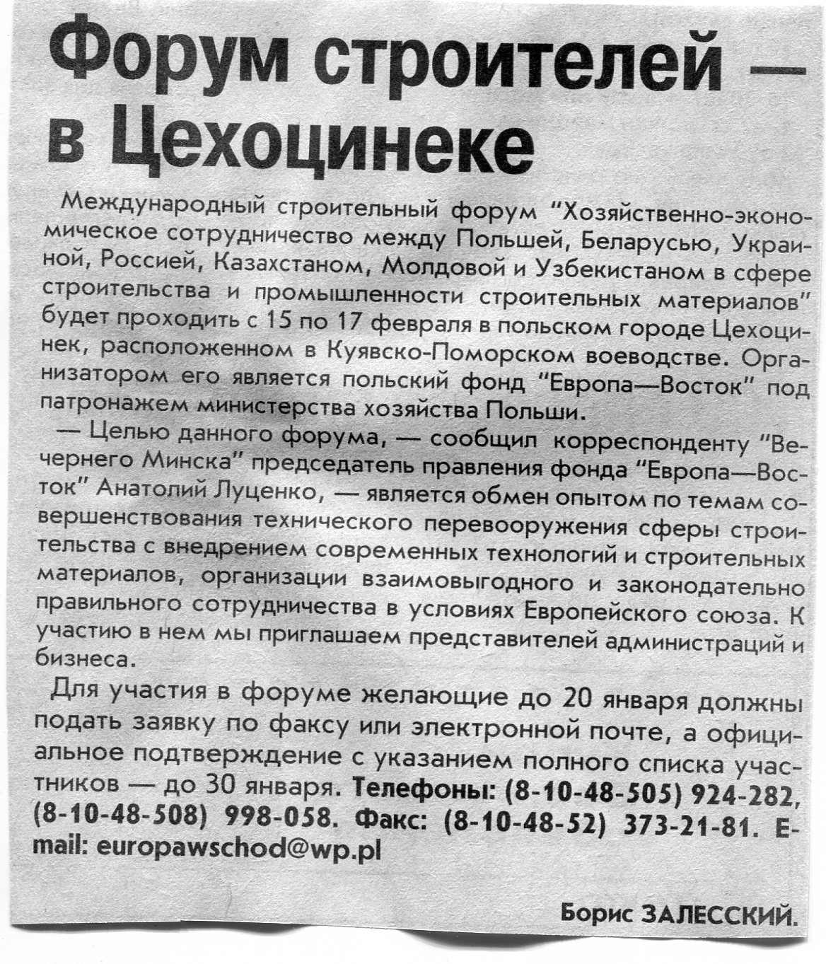 Залесский, Б. Форум строителей - в Цехоцинеке / Б. Залесский // Вечерний Минск. - 2005. - 13 янв.
