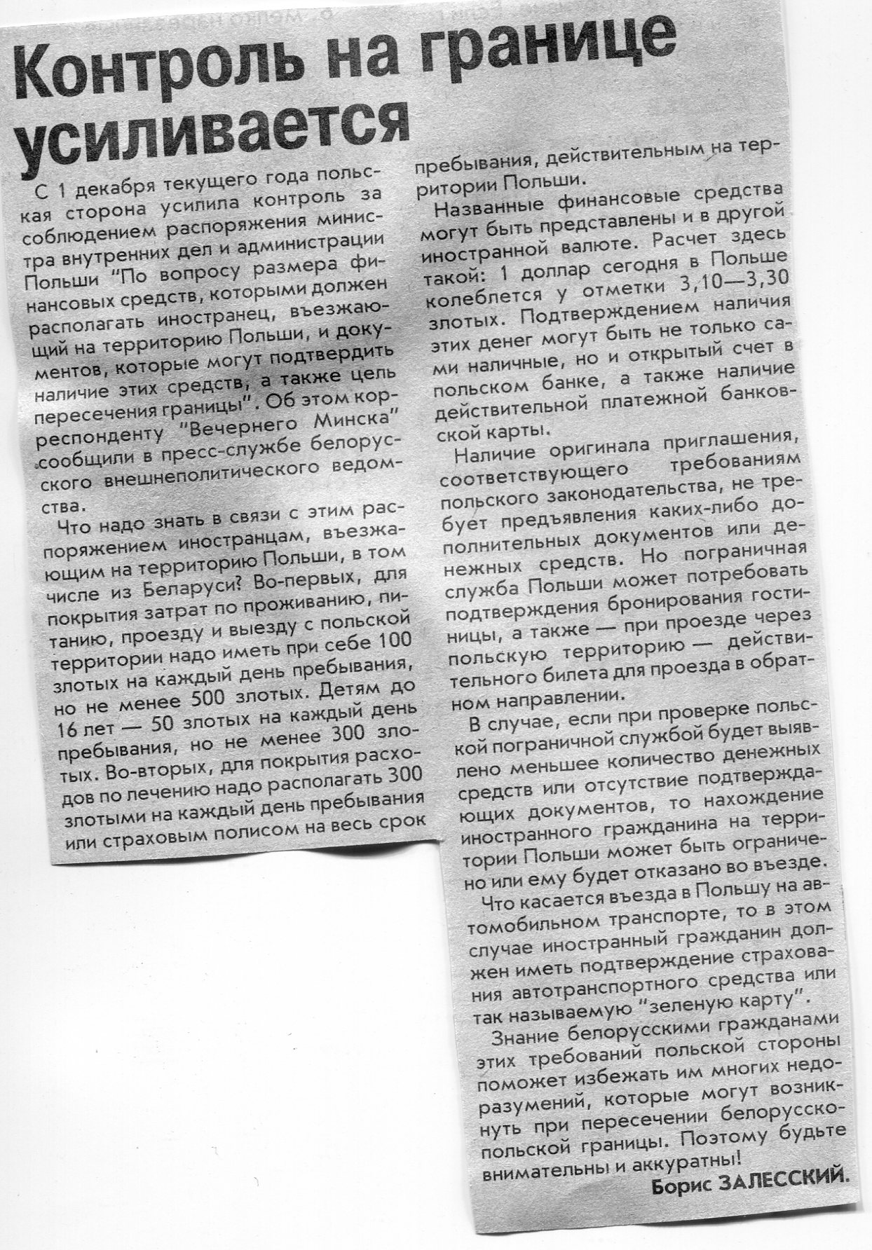 Залесский, Б. Контроль на границе усиливается / Б. Залесский // Вечерний Минск. - 2004. - 9 дек.