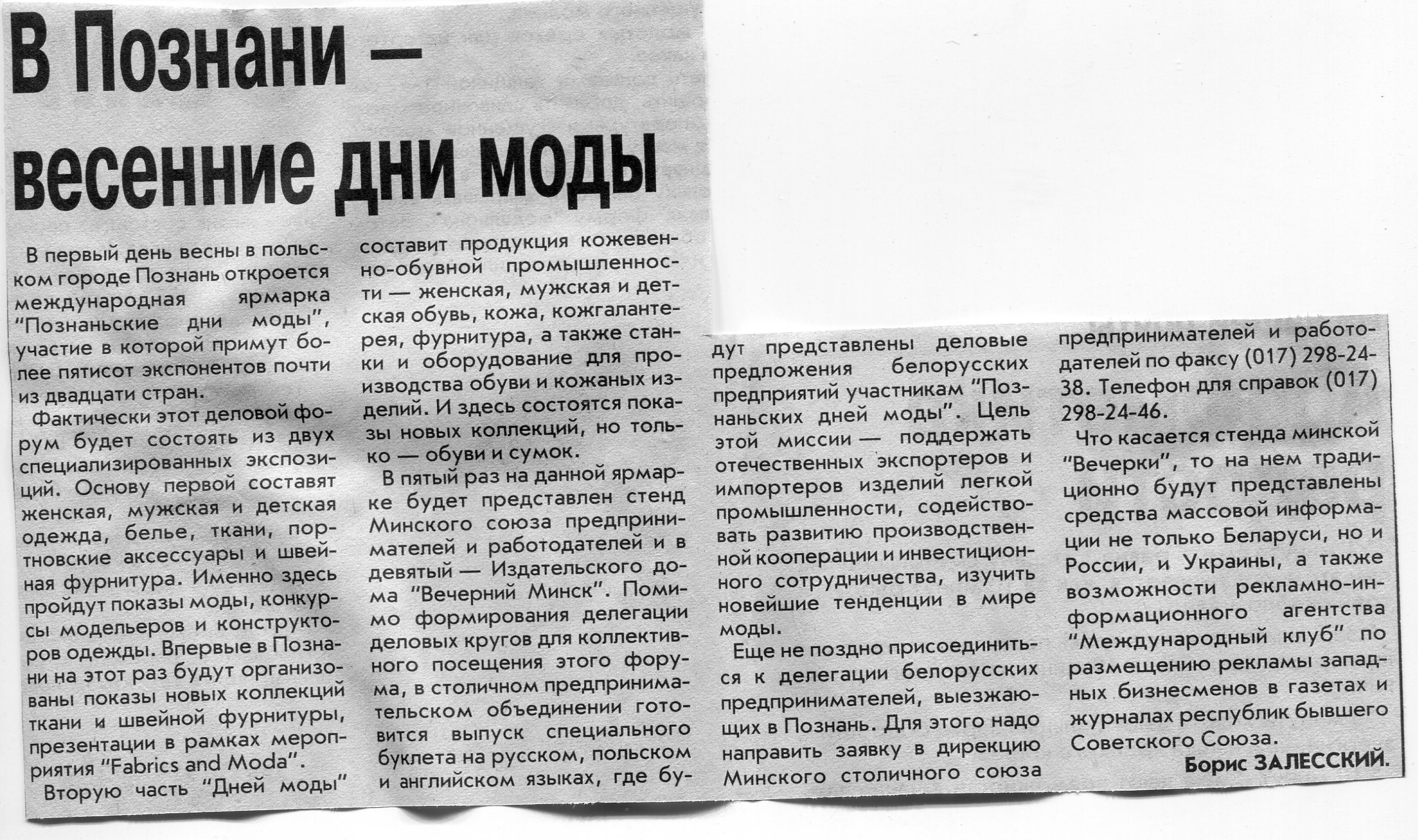 Залесский, Б. В Познани - весенние дни моды / Б. Залесский // Вечерний Минск. - 2005. - 10 февр.