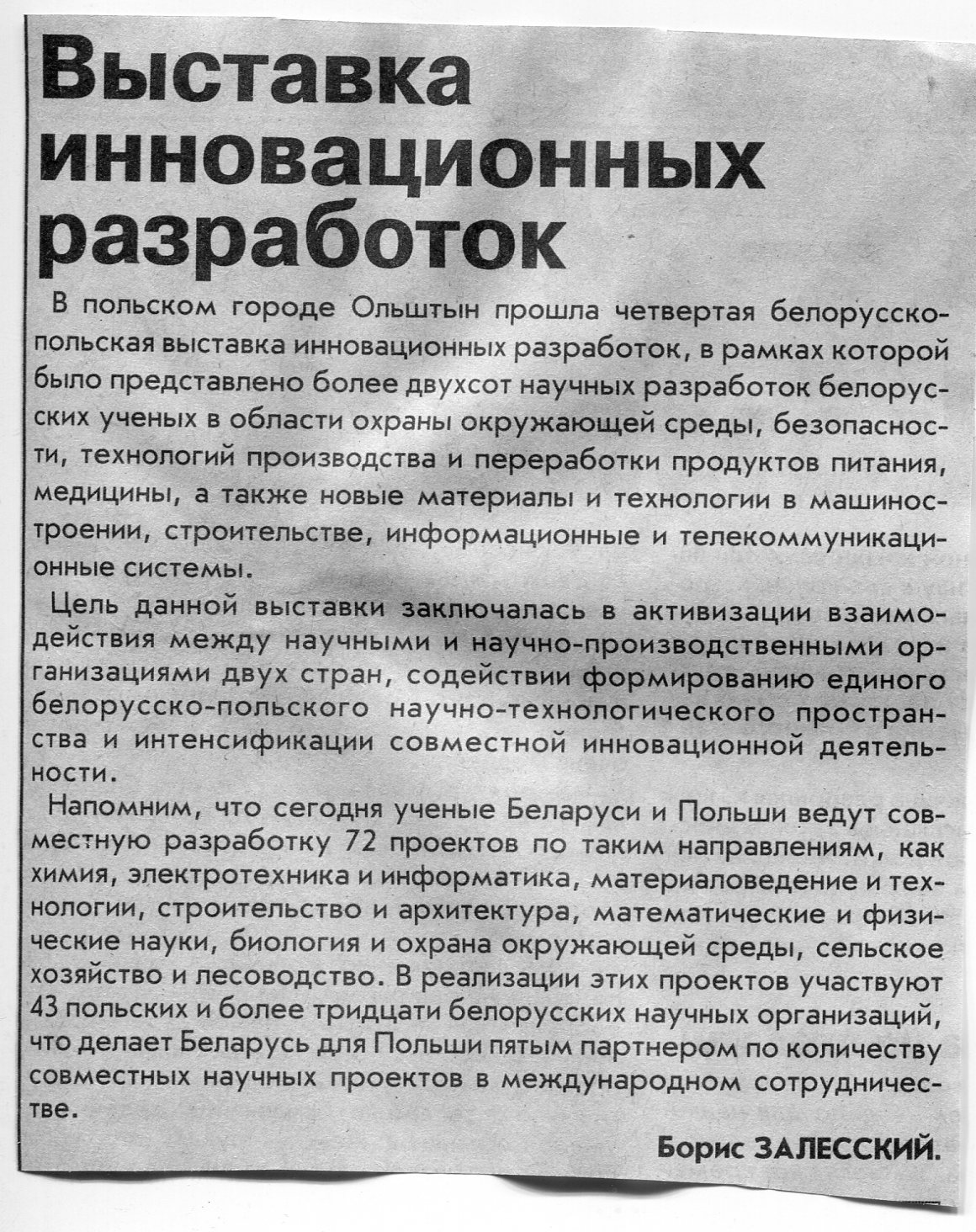 Залесский, Б. Выставка инновационных разработок / Б. Залесский // Вечерний Минск. - 2004. - 14 окт.