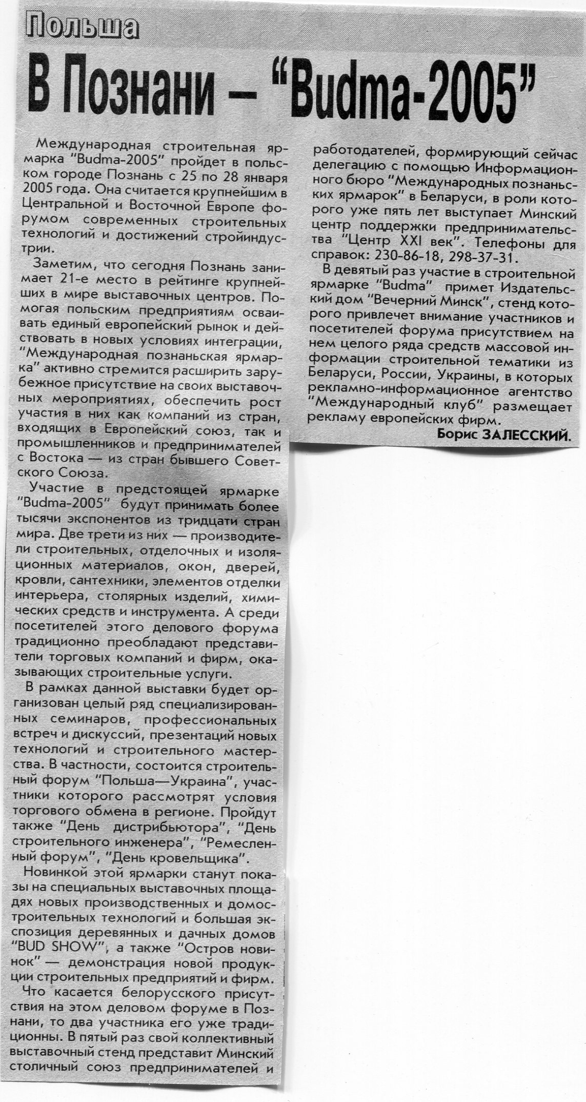 Залесский, Б. В Познани - "Budma-2005" / Б. Залесский // Вечерний Минск. - 2004. - 28 дек.