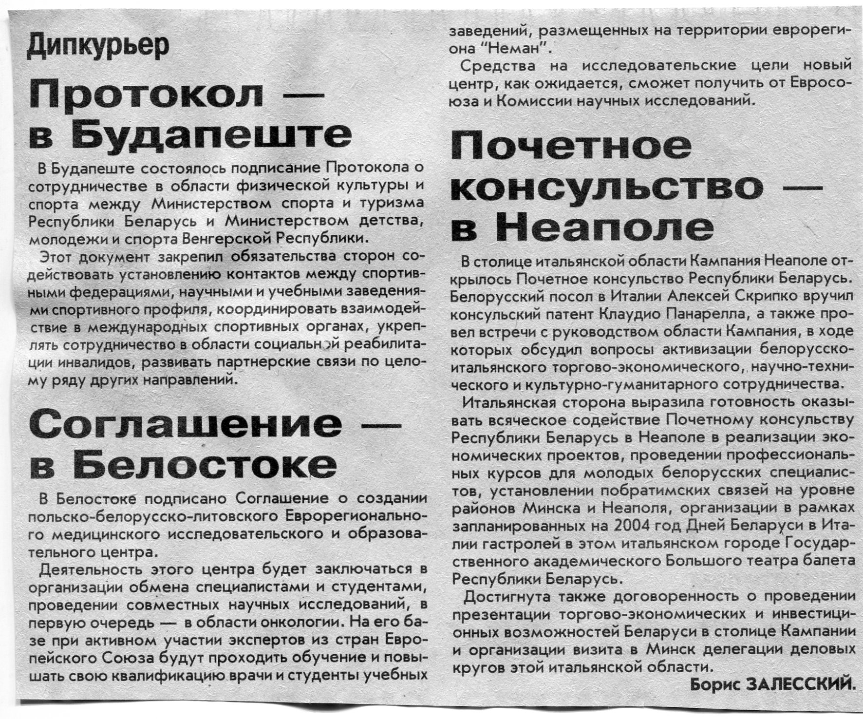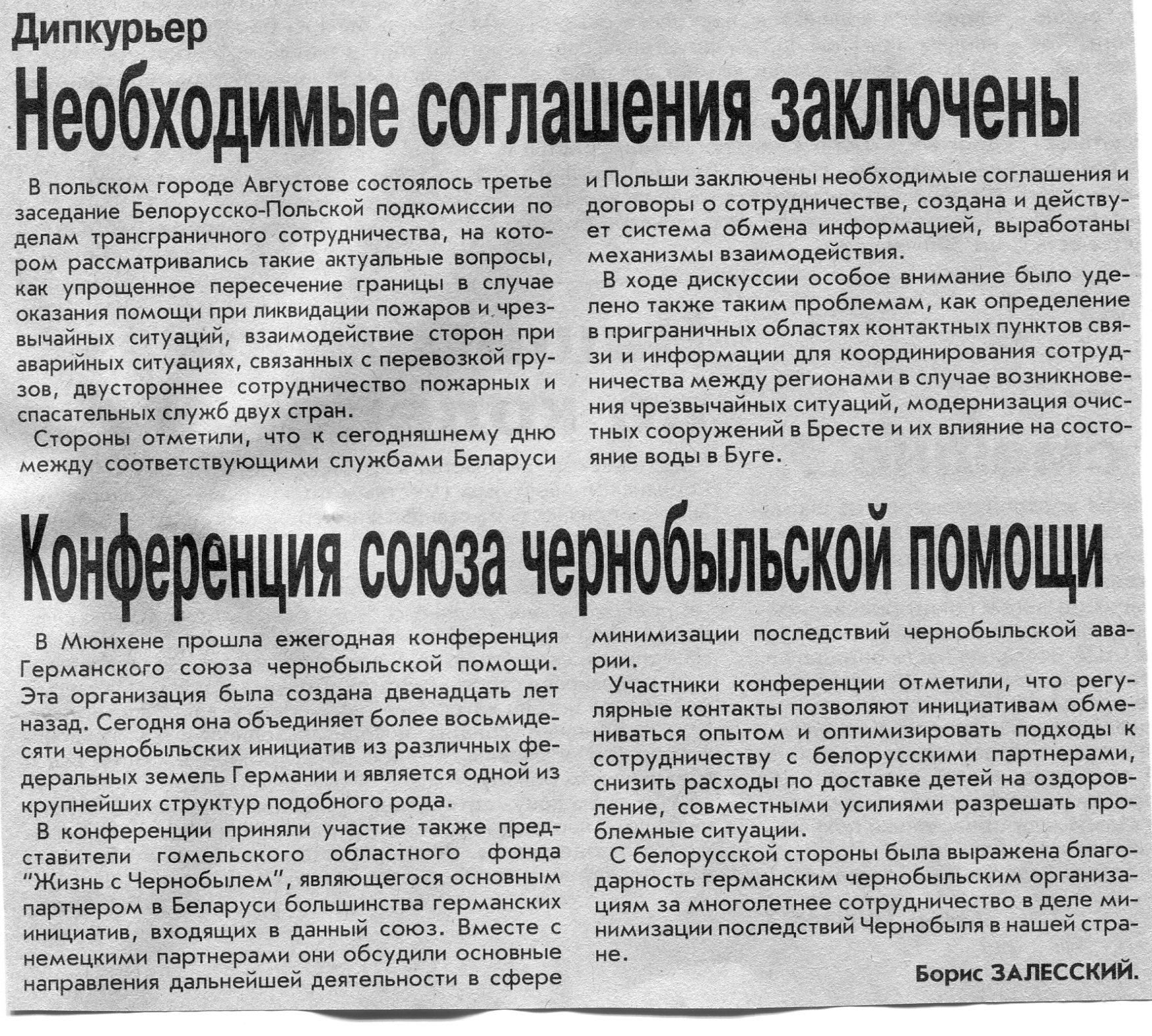 Залесский, Б. Соглашение - в Белостоке / Б. Залесский // Вечерний Минск. - 2003. - 11 нояб.