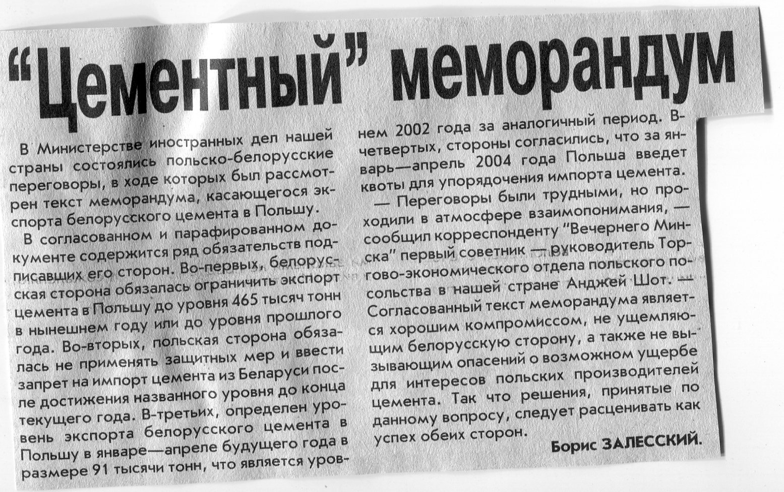 Залесский, Б. "Цементный" меморандум / Б. Залесский // Вечерний Минск. - 2003. - 8 окт.