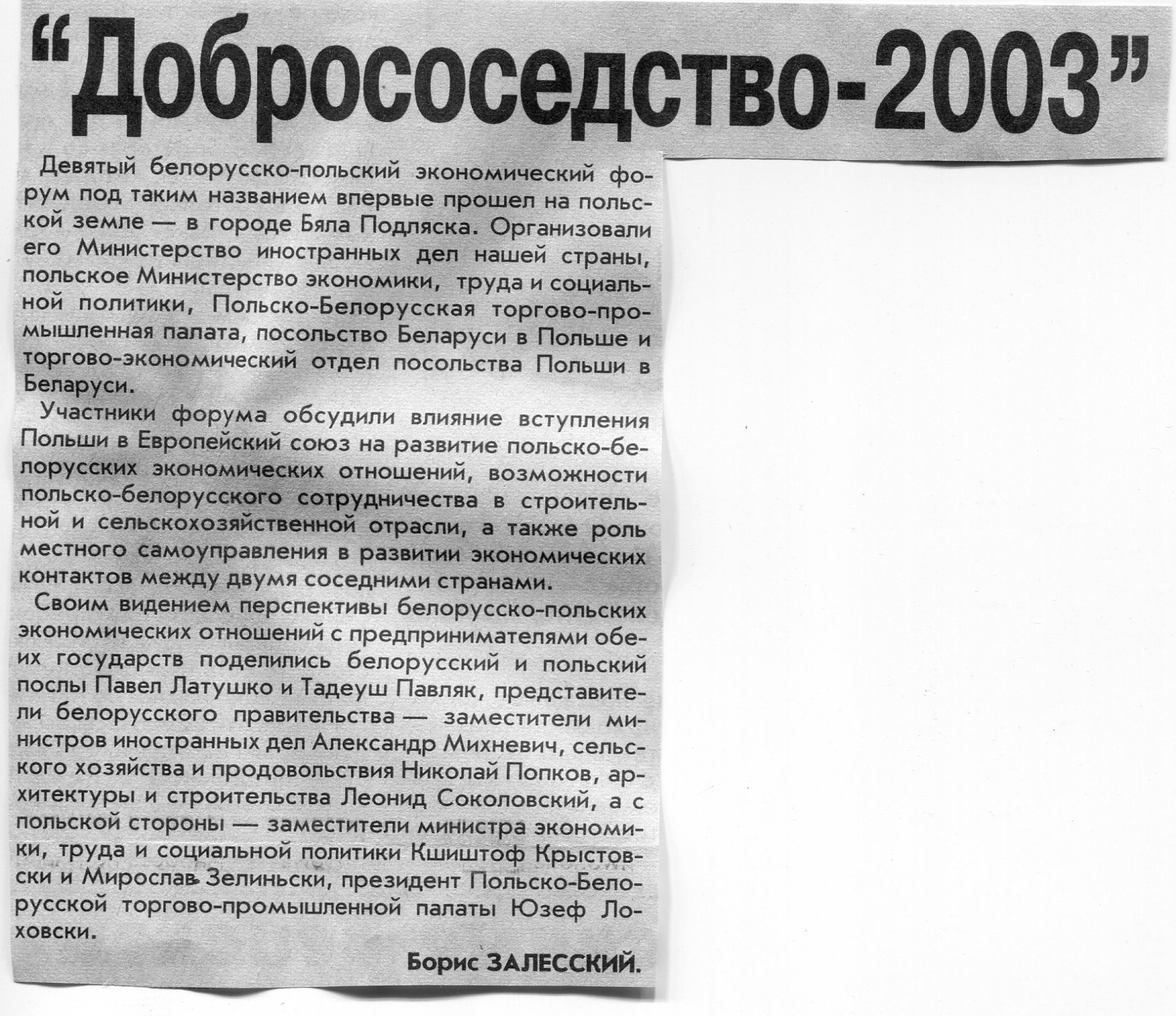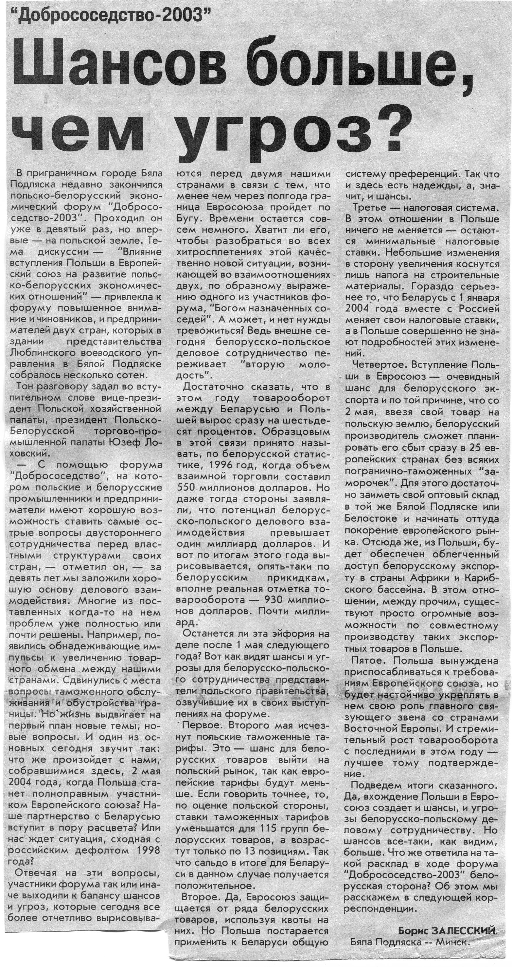 Залесский, Б. "Добрососедство-2003" / Б. Залесский // Вечерний Минск. - 2003. - 4 дек.