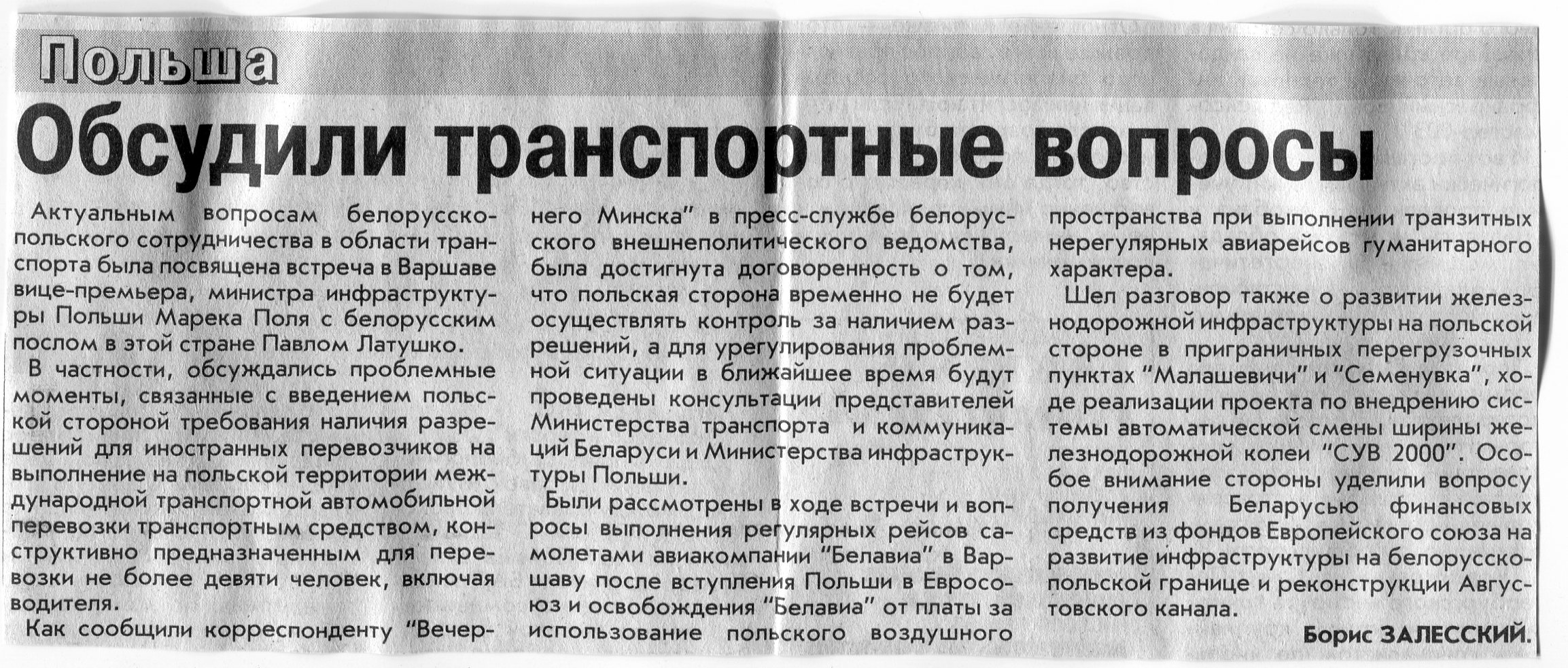 Залесский, Б. Обсудили транспортные вопросы / Б. Залесский // Вечерний Минск. - 2004. - 30 янв.