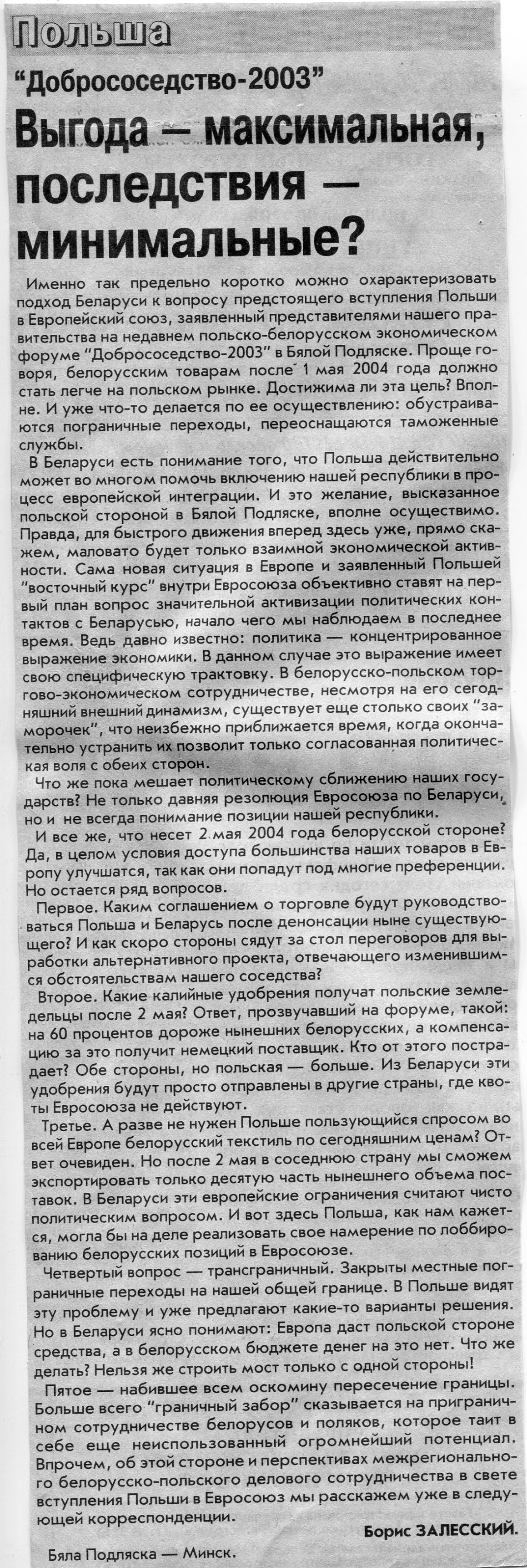 Залесский, Б. "Здесь не должно быть "железного занавеса" / Б. Залесский // Вечерний Минск. - 2004. - 3 янв.