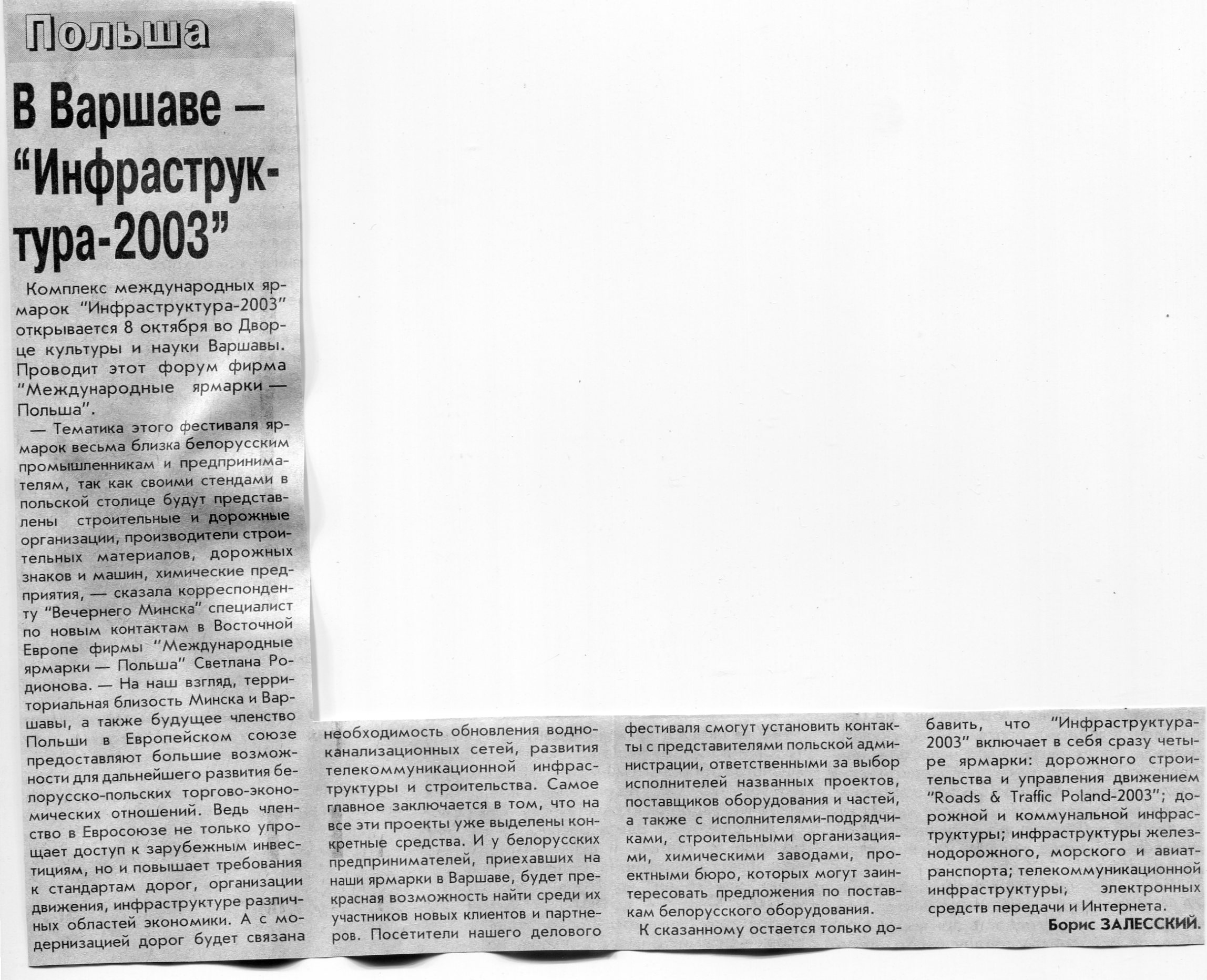 Залесский, Б. В Варшаве - "Инфраструктура-2003" / Б. Залесский // Вечерний Минск. - 2003. - 6 окт.