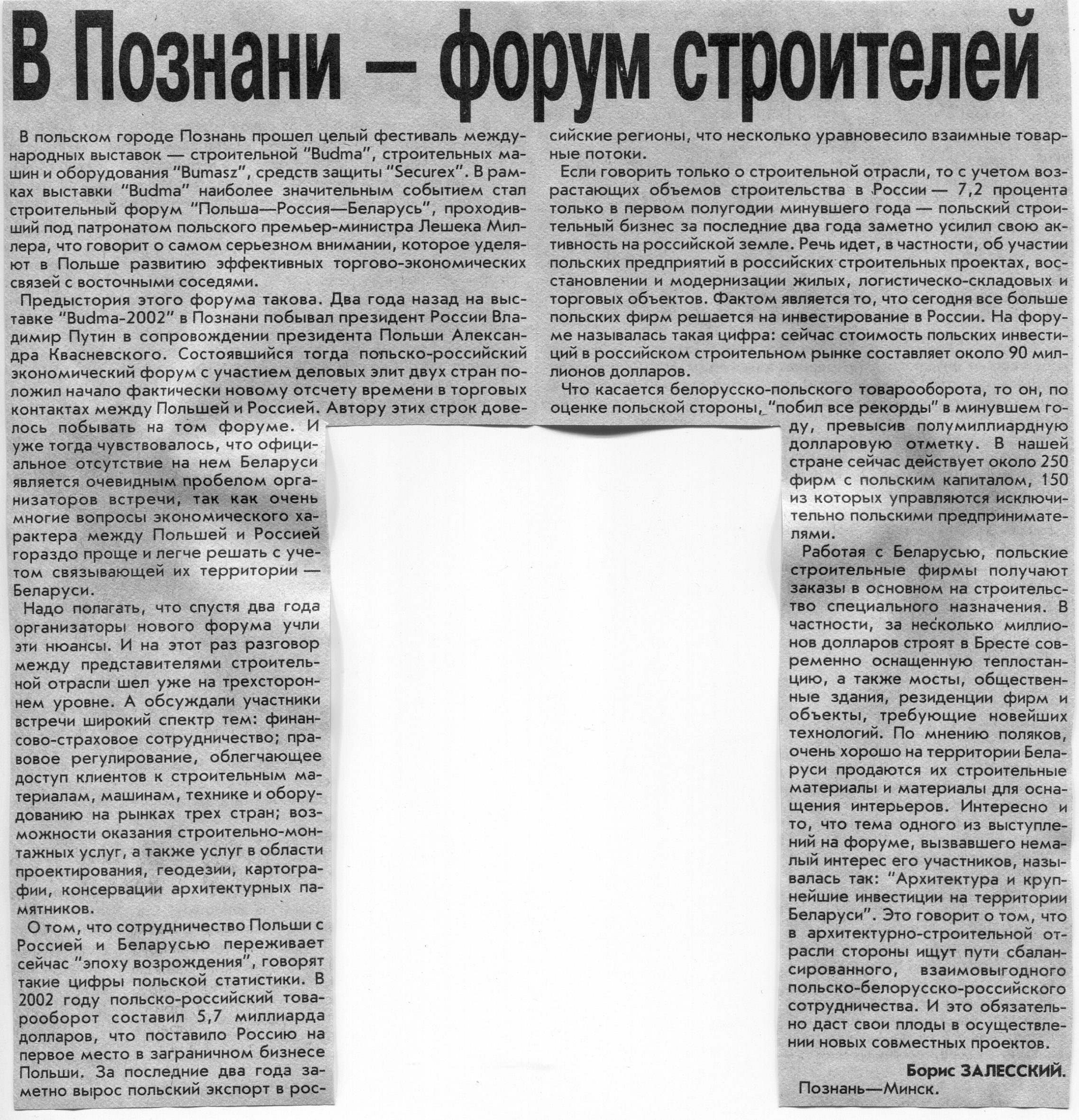 Залесский, Б. В Познани - форум строителей / Б. Залесский // Вечерний Минск. - 2004. - 29 янв.