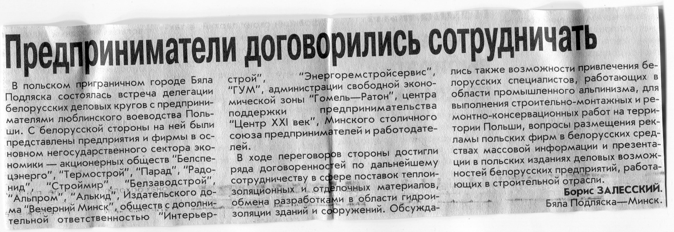 Залесский, Б. Предприниматели договорились сотрудничать / Б. Залесский // Вечерний Минск. - 2004. - 5 февр.