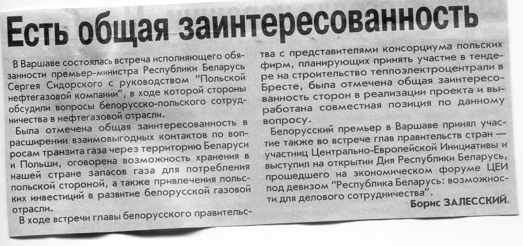 Залесский, Б. Есть общая заинтересованность / Б. Залесский // Вечерний Минск. - 2003. - 27 нояб.