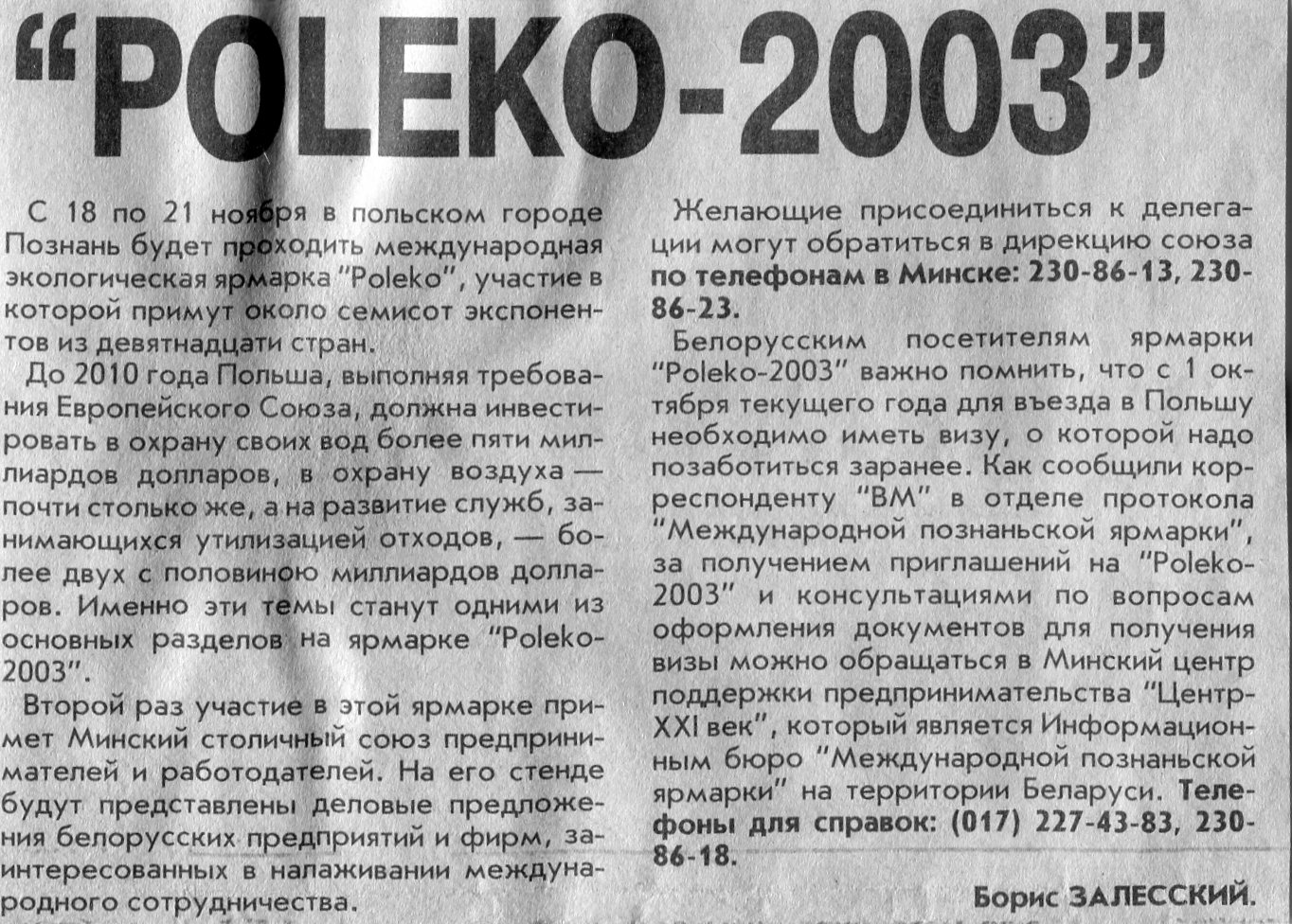 Залесский, Б. "Poleko-2003" / Б. Залесский // Вечерний Минск. - 2003. - 22 окт.
