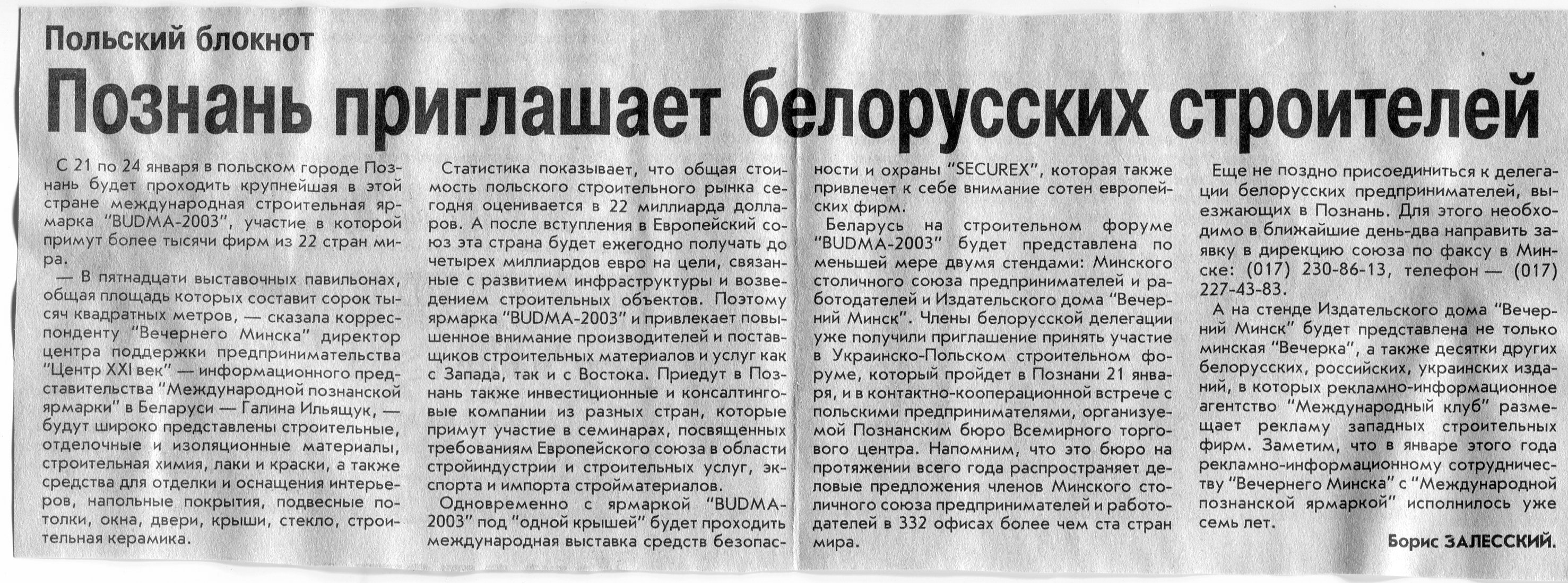 Залесский, Б. Познань приглашает белорусских строителей / Б. Залесский // Вечерний Минск. - 2003. - 14 янв.