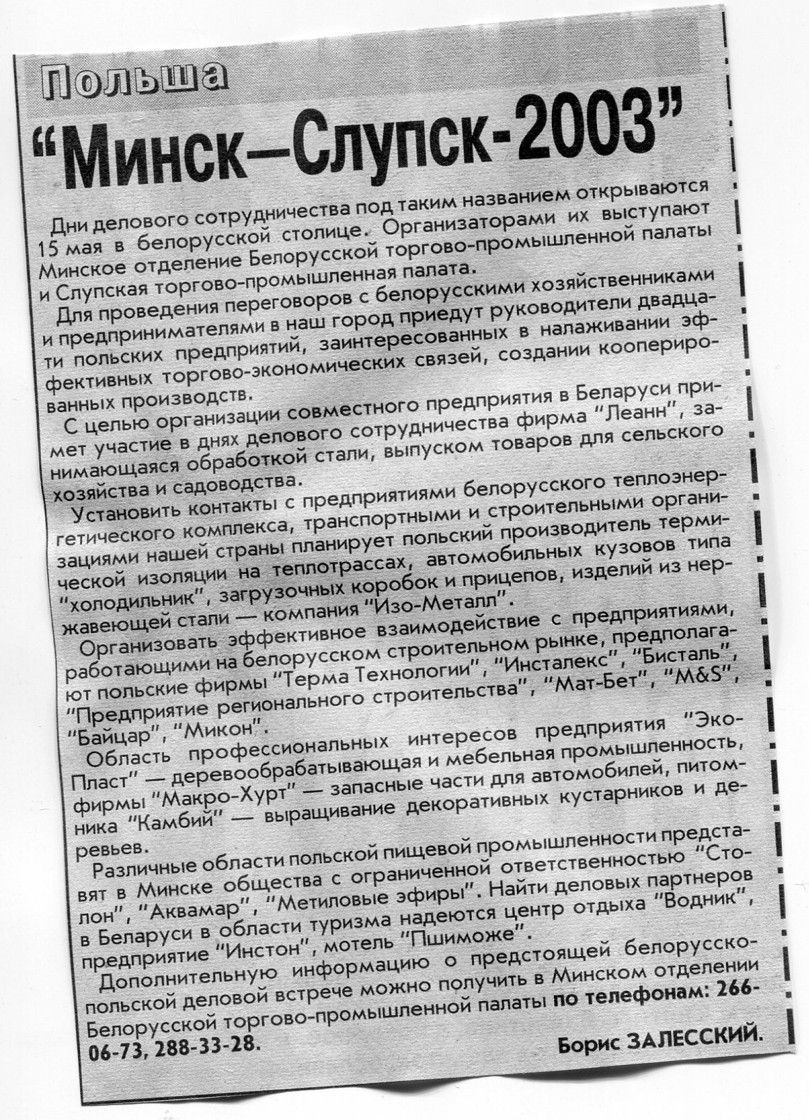 Залесский, Б. "Минск - Слупск - 2003" / Б. Залесский // Вечерний Минск. - 2003. - 13 мая.