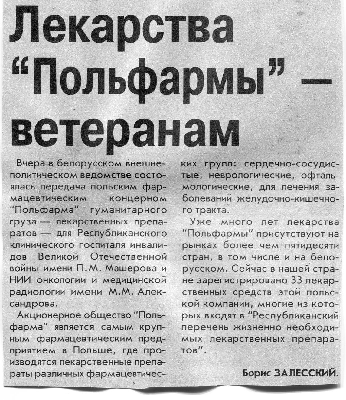 Залесский, Б. Лекарства "Польфармы" - ветеранам / Б. Залесский // Вечерний Минск. - 2003. - 9 апр.