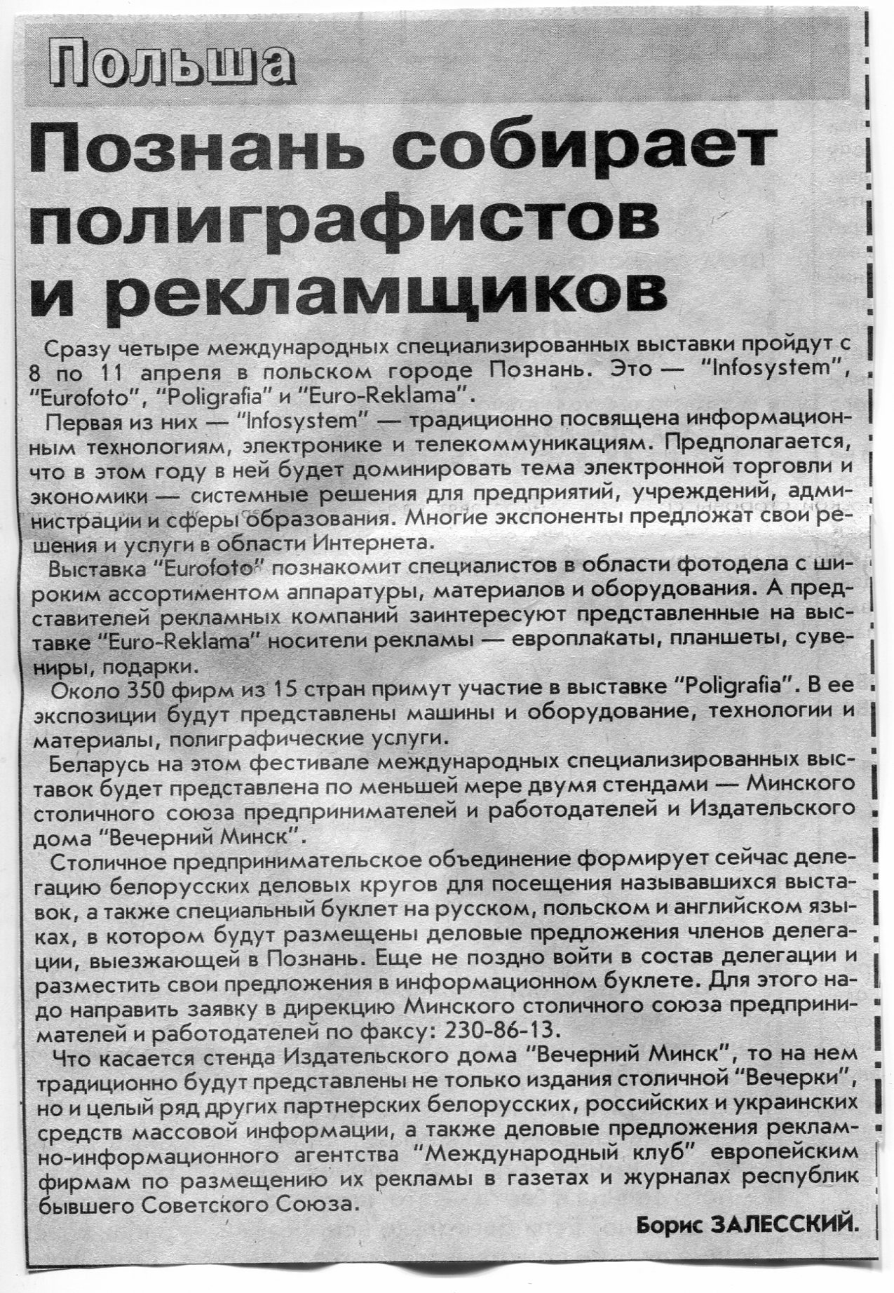 Залесский, Б. Познань собирает полиграфистов и рекламщиков / Б. Залесский // Вечерний Минск. - 2003. - 27 мар.