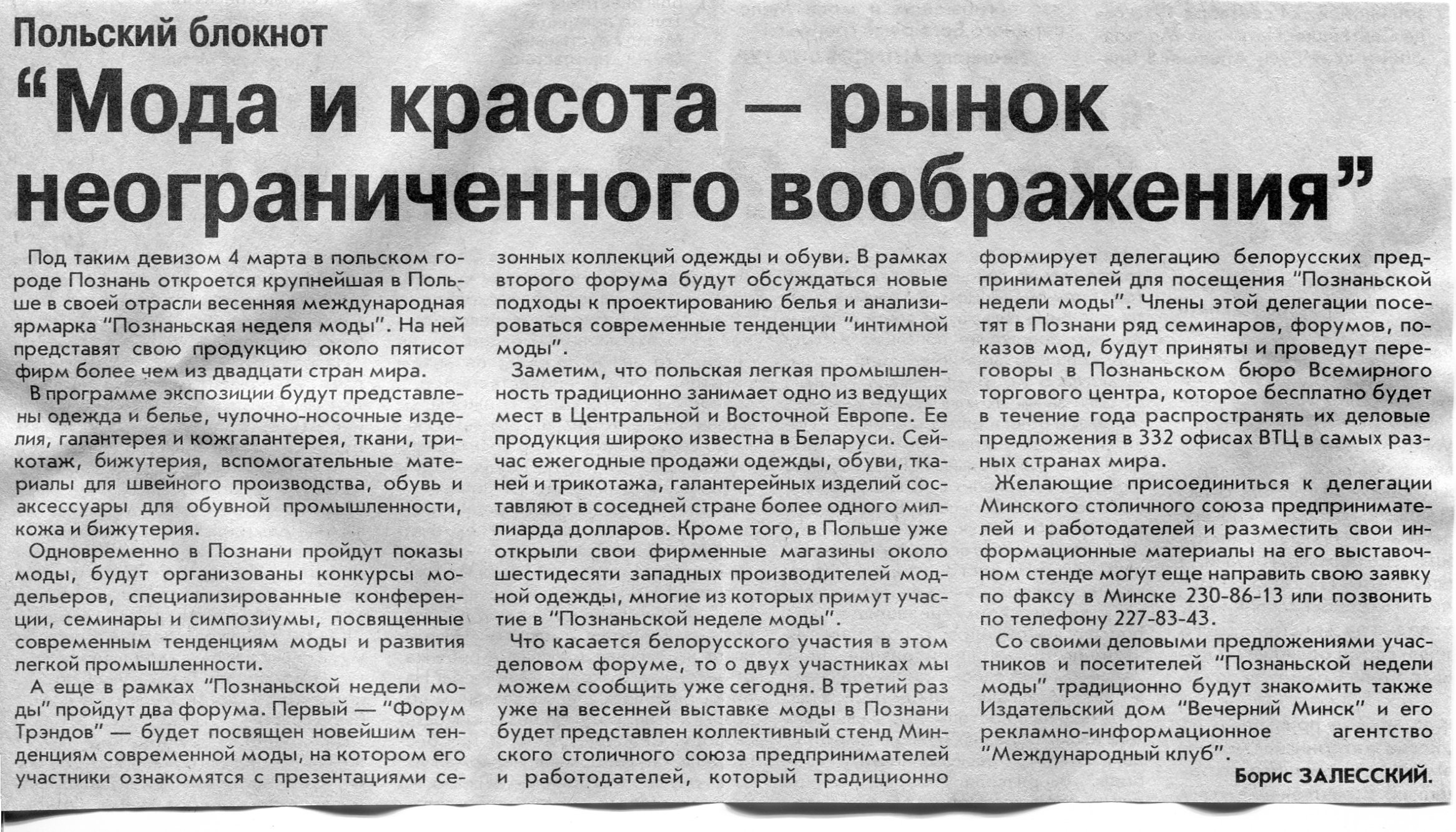 Залесский, Б. "Мода и красота - рынок неограниченного воображения" / Б. Залесский // Вечерний Минск. - 2003. - 4 февр.