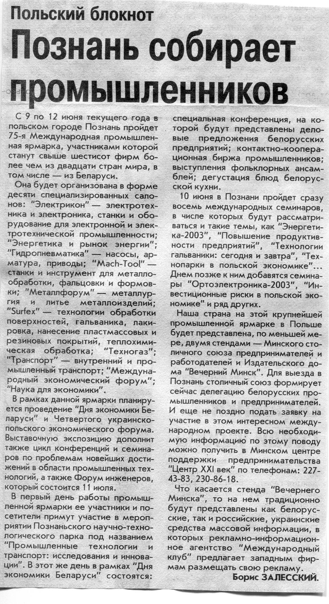 Залесский, Б. Познань собирает промышленников / Б. Залесский // Вечерний Минск. - 2003. - 28 мая.