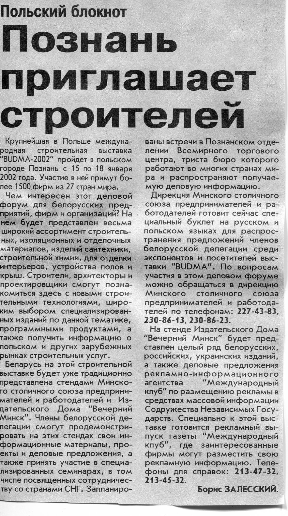 Залесский, Б. Познань приглашает строителей / Б. Залесский // Вечерний Минск. - 2002. - 4 янв.