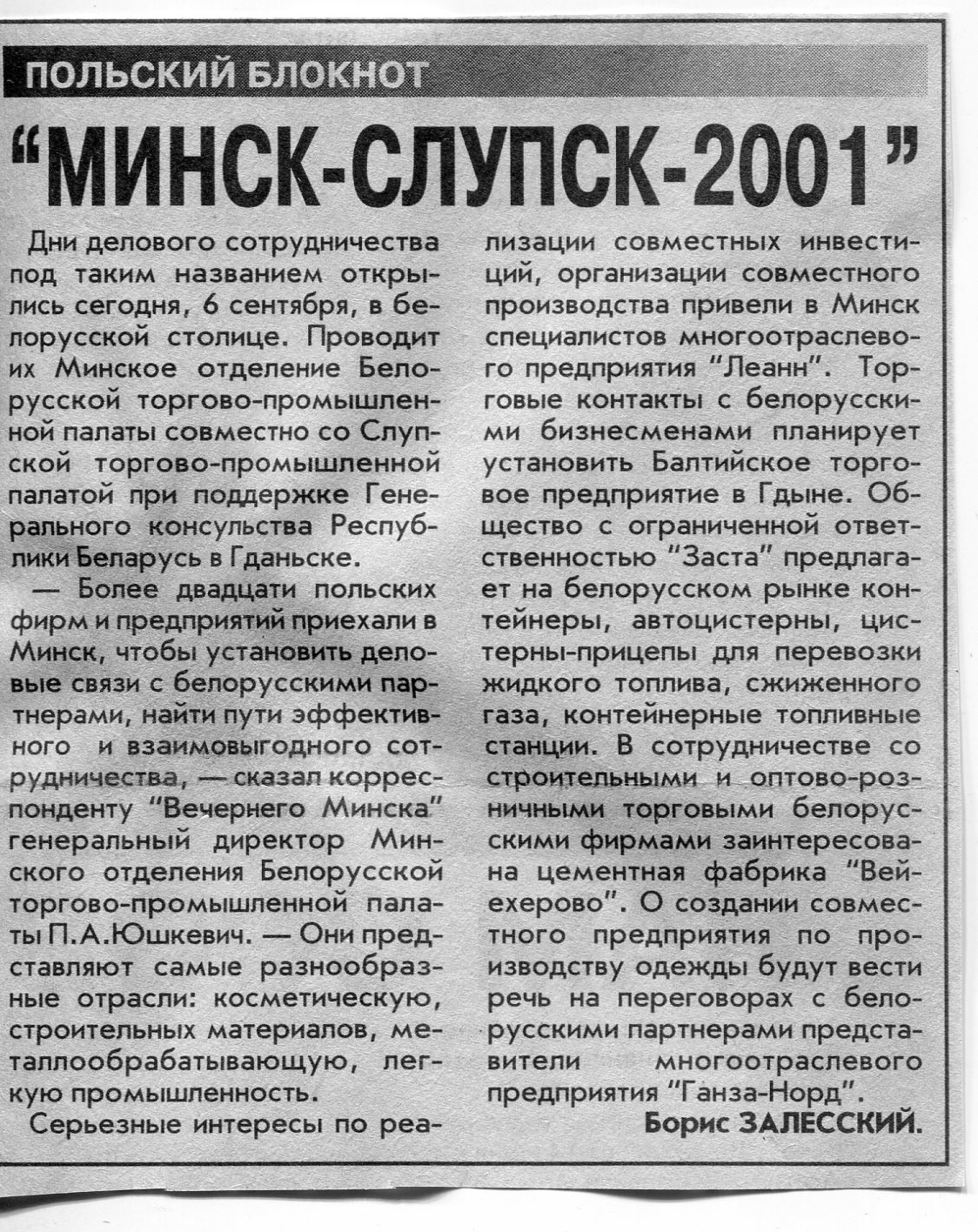 Залесский, Б. "Минск - Слупск - 2001" / Б. Залесский // Вечерний Минск. - 2001. - 6 сент.