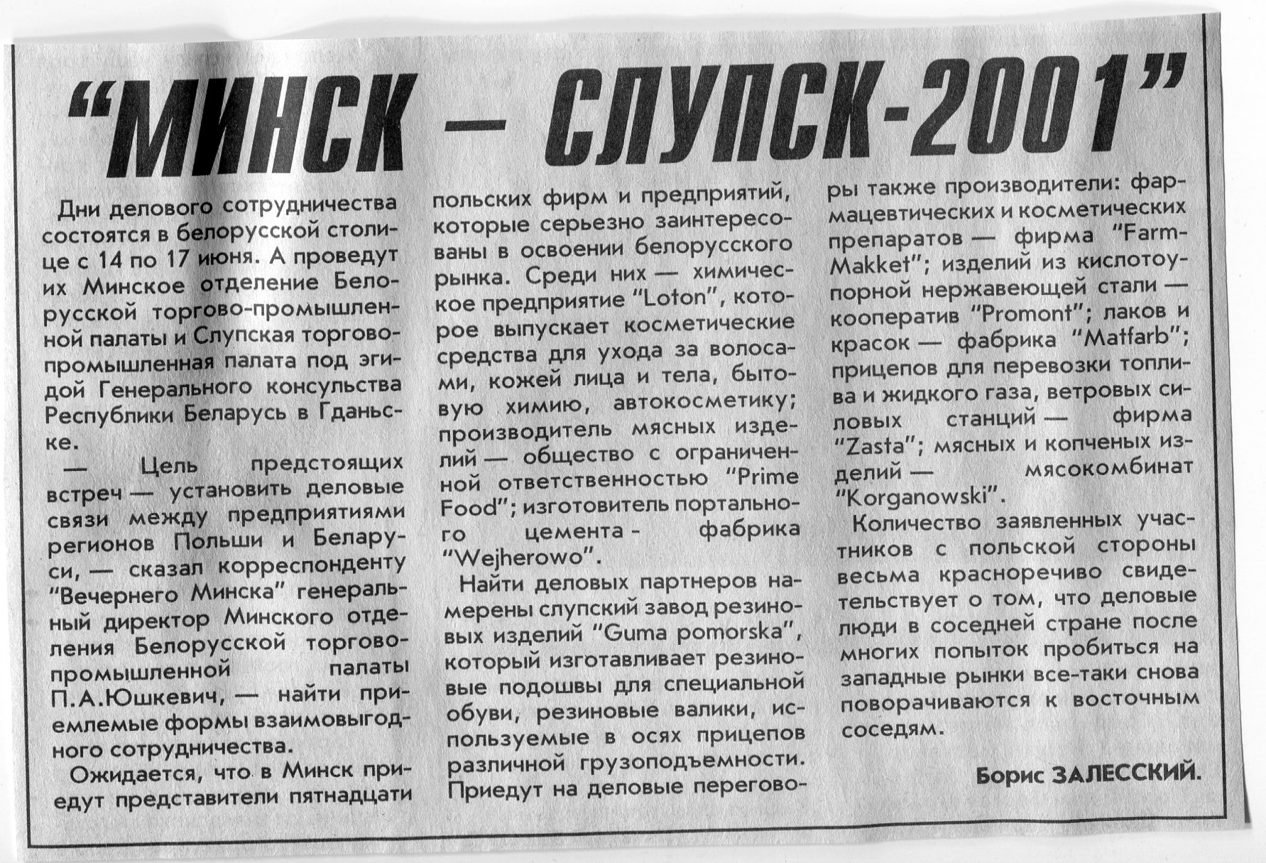 Залесский, Б. "Минск - Слупск - 2001" / Б. Залесский // Вечерний Минск. - 2001. - 14 июн.