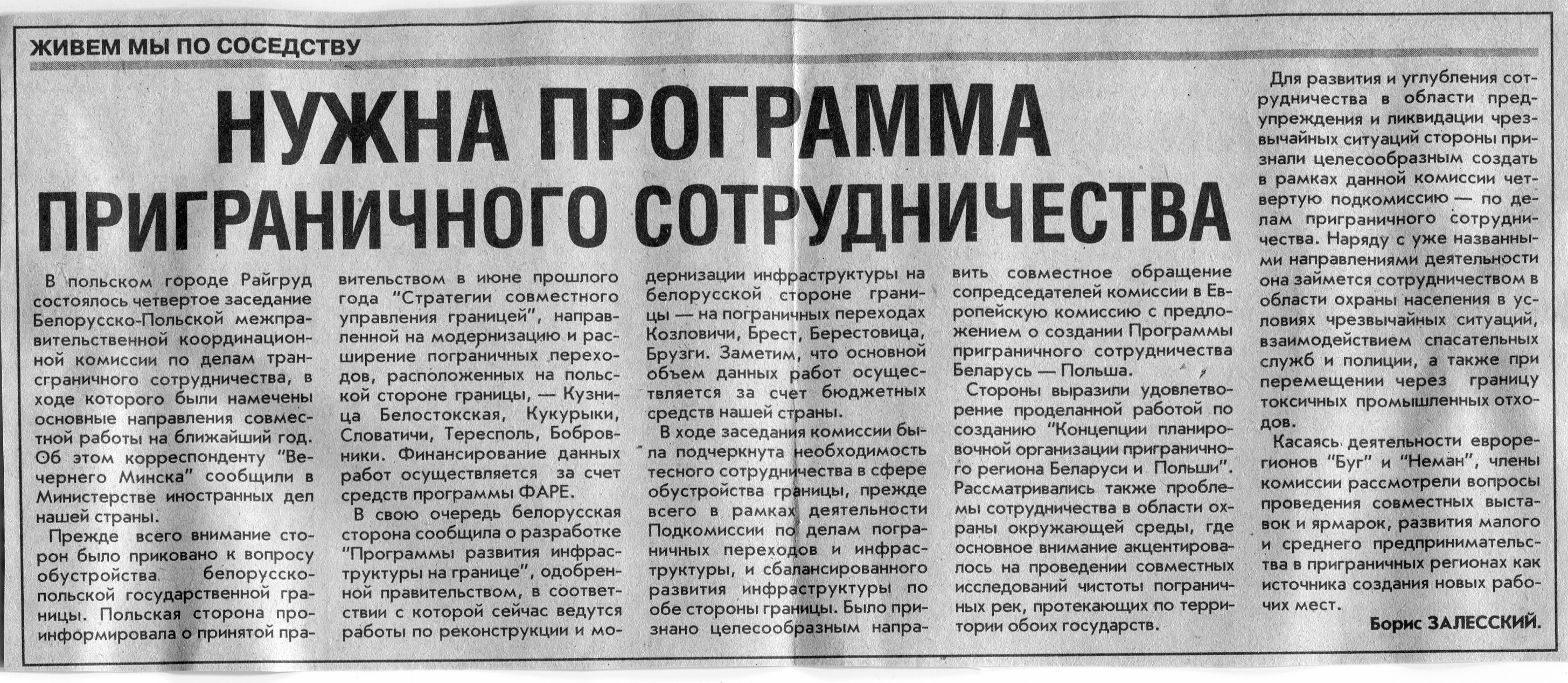 Залесский, Б. Нужна программа приграничного сотрудничества / Б. Залесский // Вечерний Минск. - 2001. - 11 апр.
