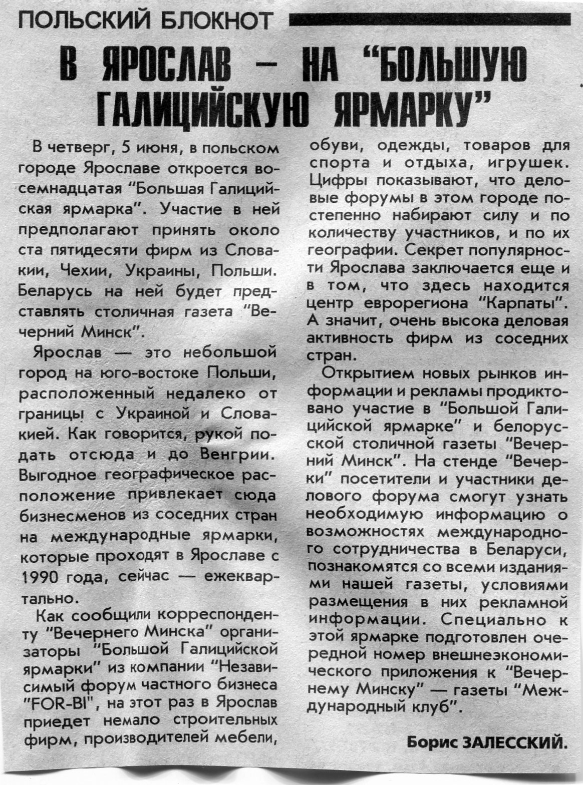 Залесский, Б. В Ярослав - на "Большую Галицийскую ярмарку" / Б. Залесский // Вечерний Минск. - 1997. - 3 июн.