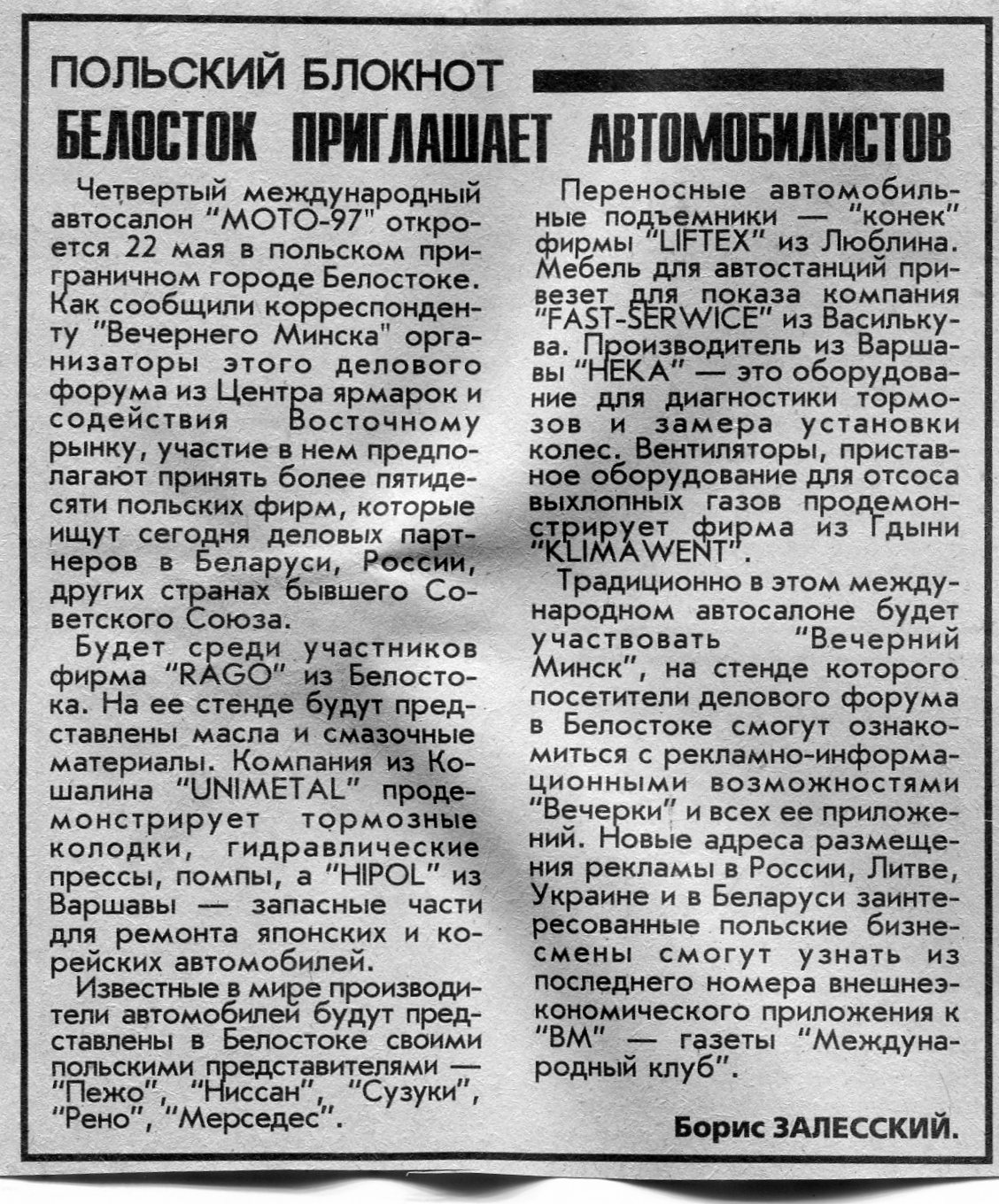 Залесский, Б. Белосток приглашает автомобилистов / Б. Залесский // Вечерний Минск. - 1997. - 20 мая.