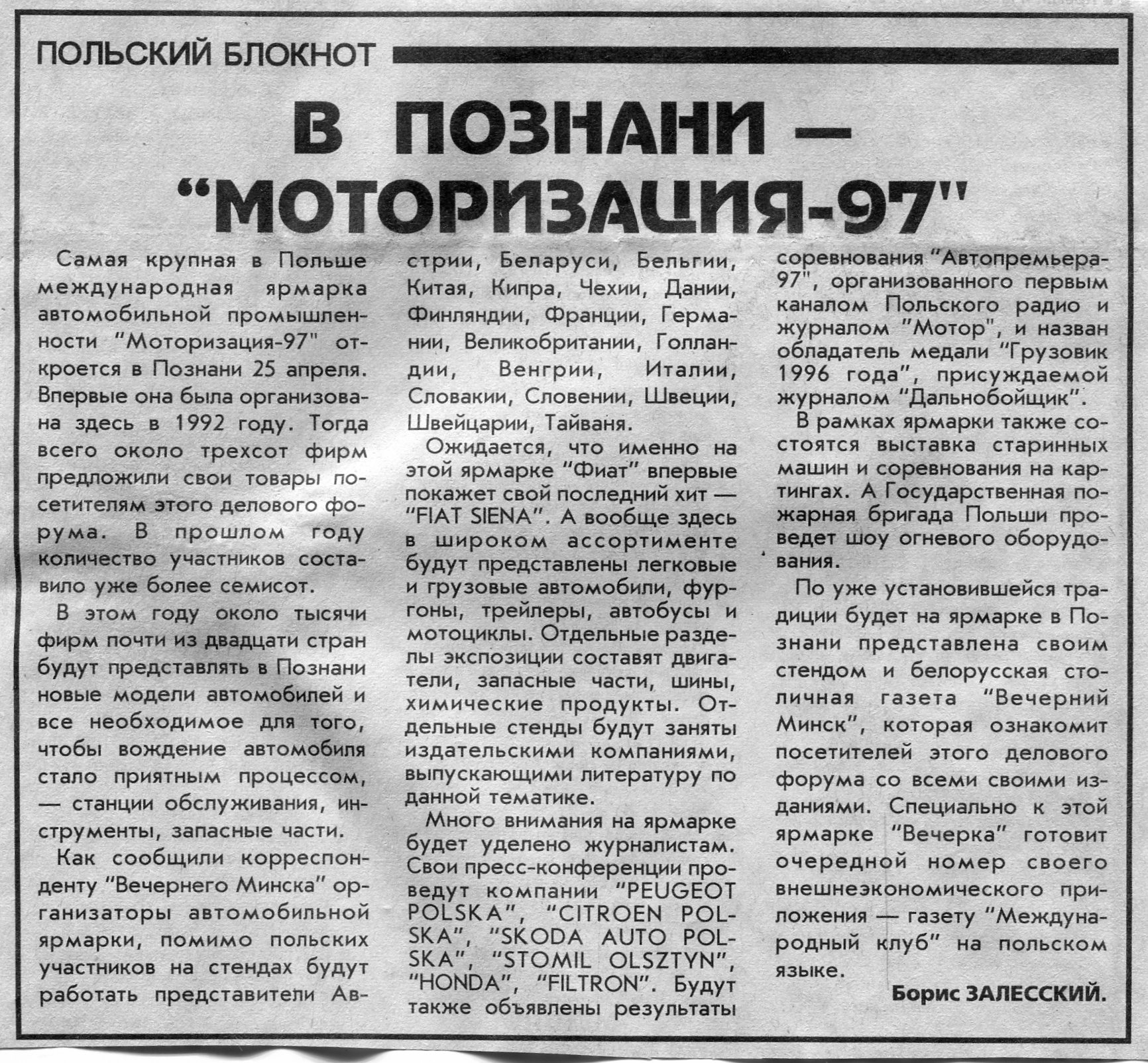 Залесский, Б. В Познани - "Моторизация-97" / Б. Залесский // Вечерний Минск. - 1997. - 22 апр.