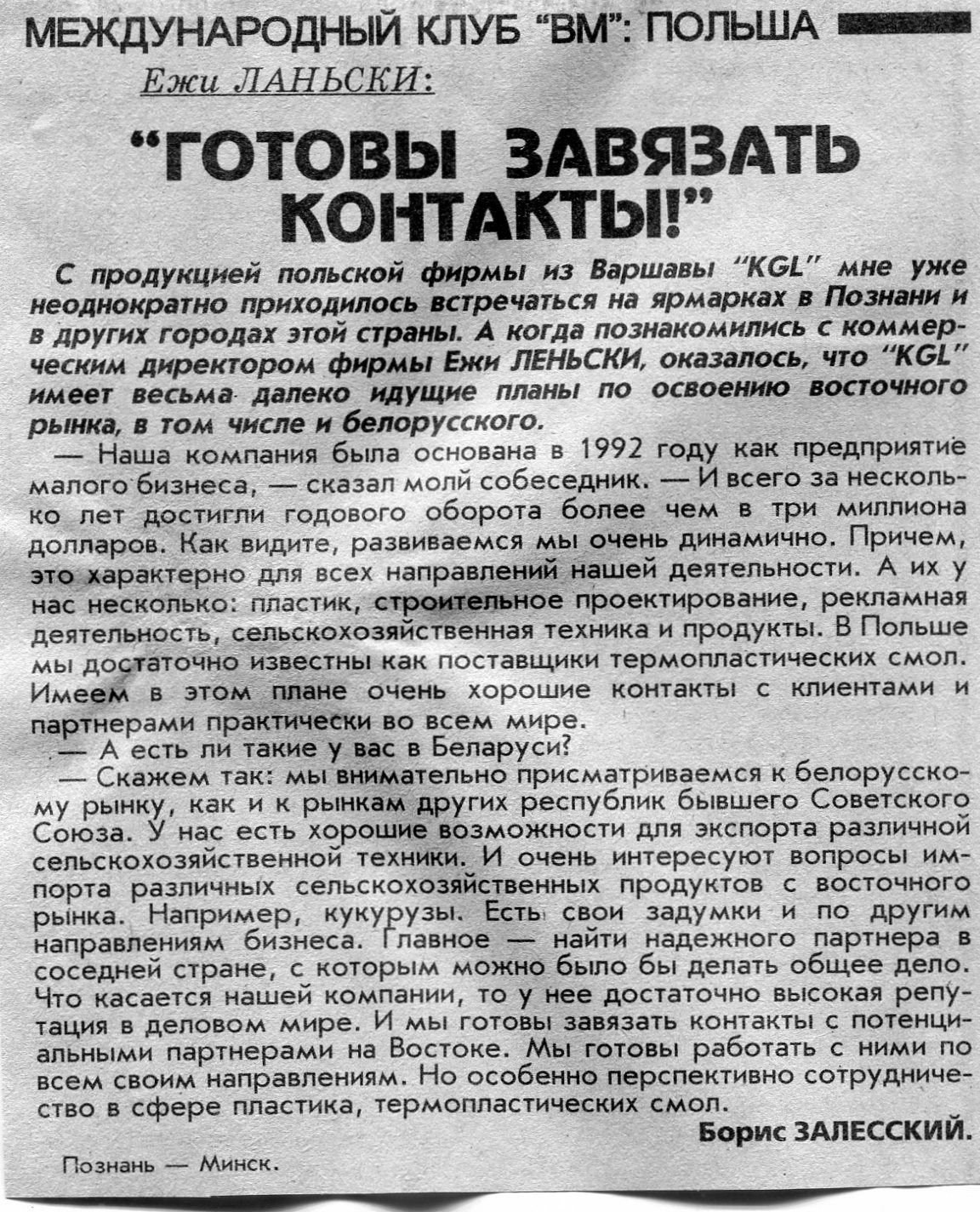 Залесский, Б. Ежи Ланьски: "Готовы завязать контакты!" / Б. Залесский // Вечерний Минск. - 1997. - 24 мар.