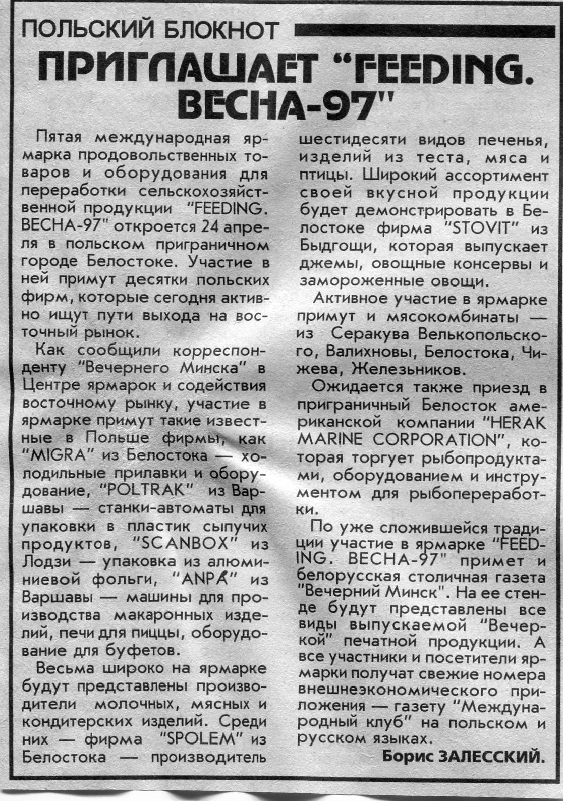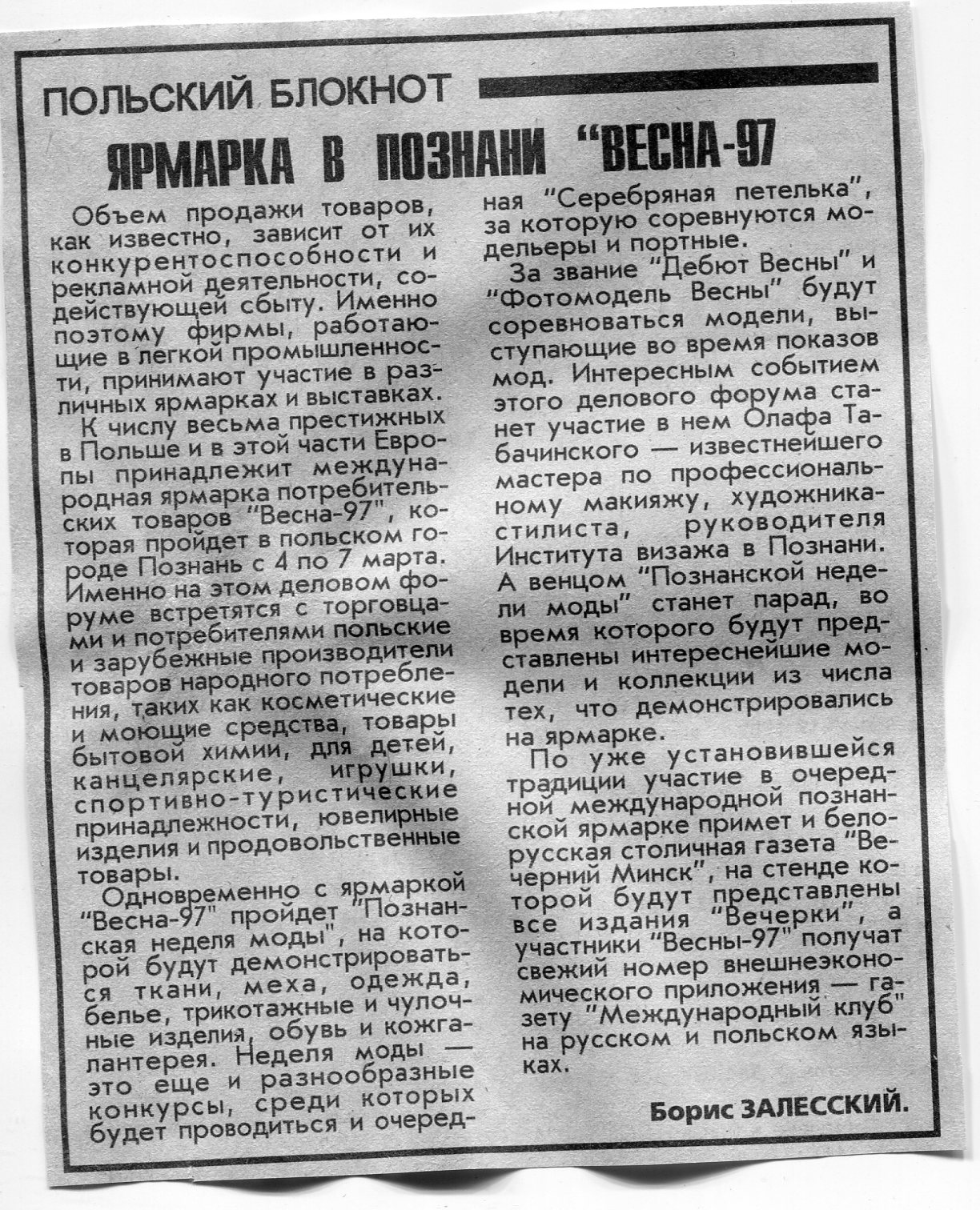 Залесский, Б. Ярмарка в Познани "Весна-97" / Б. Залесский // Вечерний Минск. - 1997. - 25 февр.