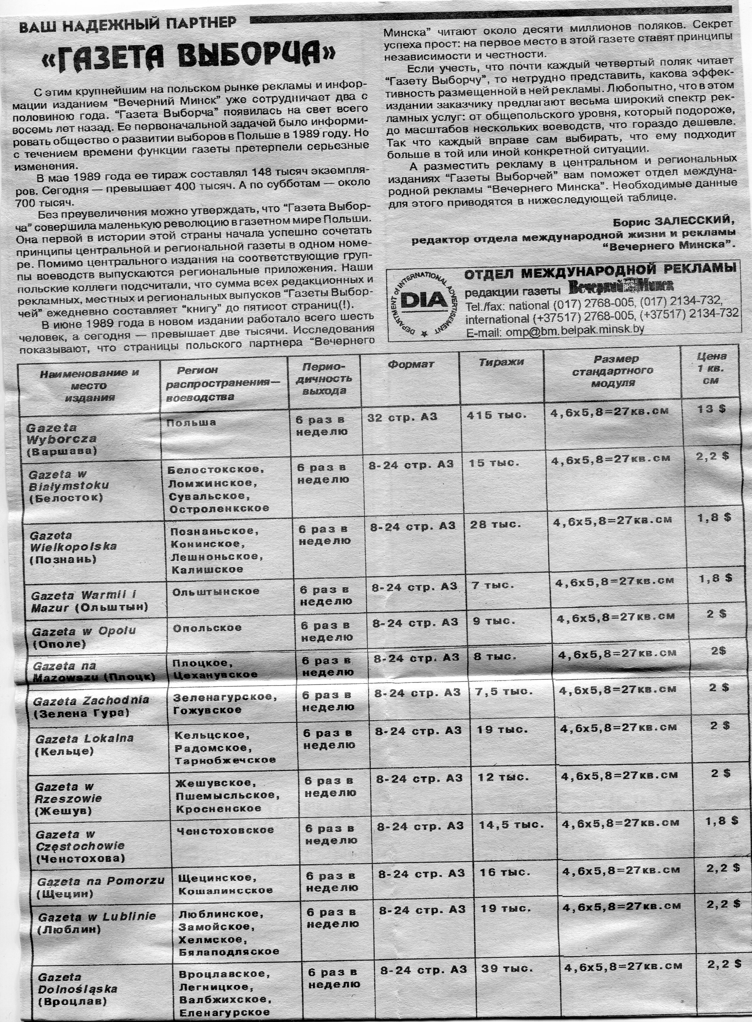 Залесский, Б. "Газета Выборча" / Б. Залесский // Вечерний Минск. - 1997. - 29 апр.