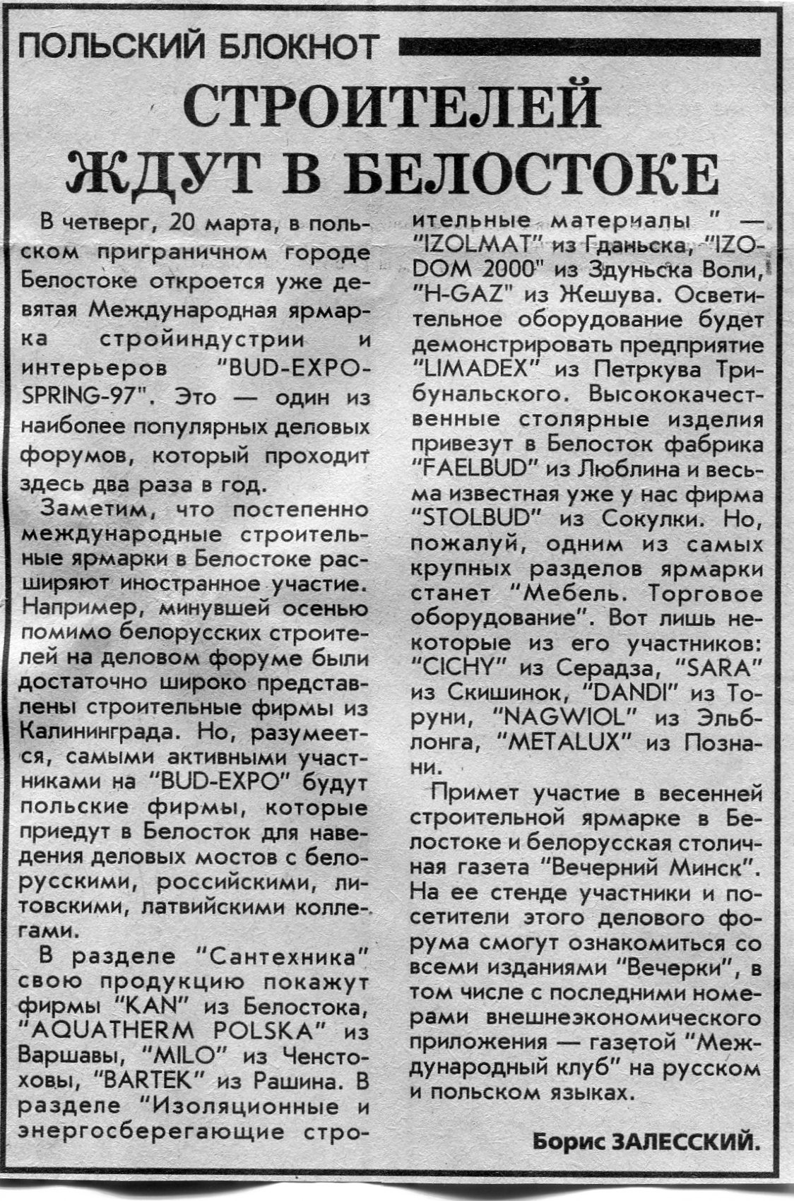 Залесский, Б. Строителей ждут в Белостоке / Б. Залесский // Вечерний Минск. - 1997. - 18 мар.