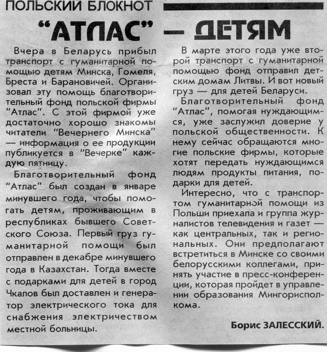 Залесский, Б. "Атлас" - детям / Б. Залесский // Вечерний Минск. - 1997. - 29 мая.