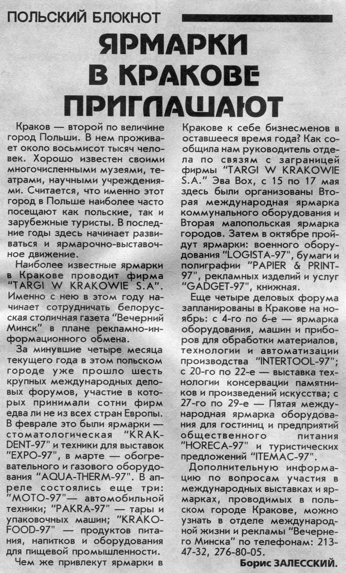 Залесский, Б. Ярмарки в Кракове приглашают / Б. Залесский // Вечерний Минск. - 1997. - 21 мая.