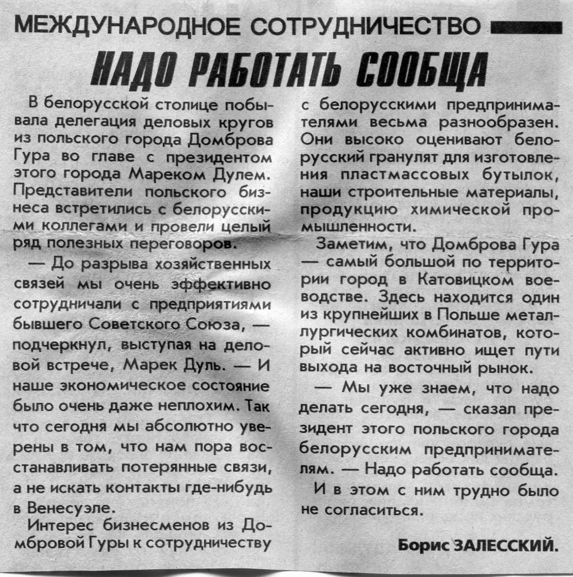 Залесский, Б. Надо работать сообща / Б. Залесский // Вечерний Минск. - 1997. - 14 мая.
