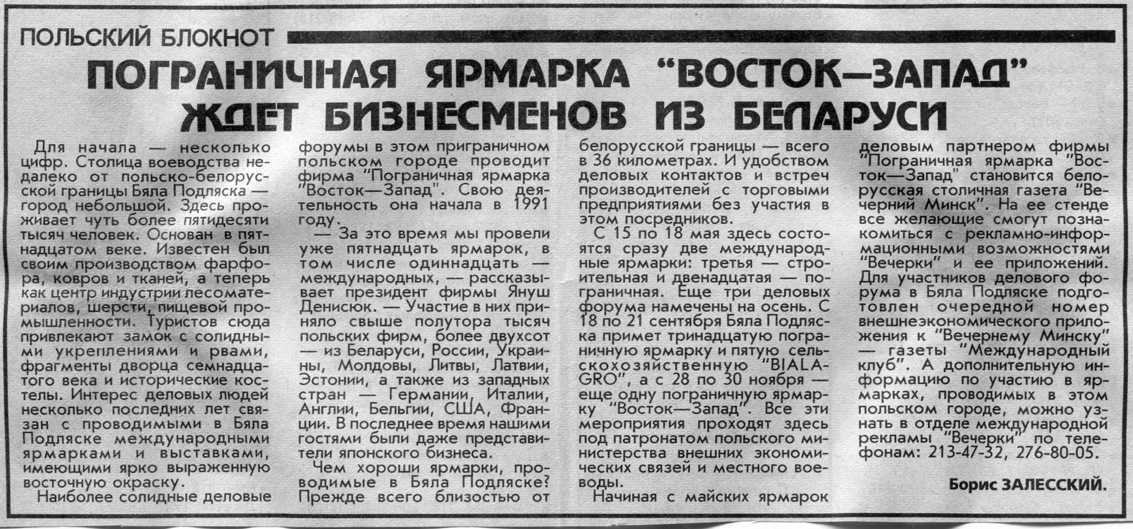 Залесский, Б. Пограничная ярмарка "Восток - Запад" ждет бизнесменов из Беларуси / Б. Залесский // Вечерний Минск. - 1997. - 13 мая.