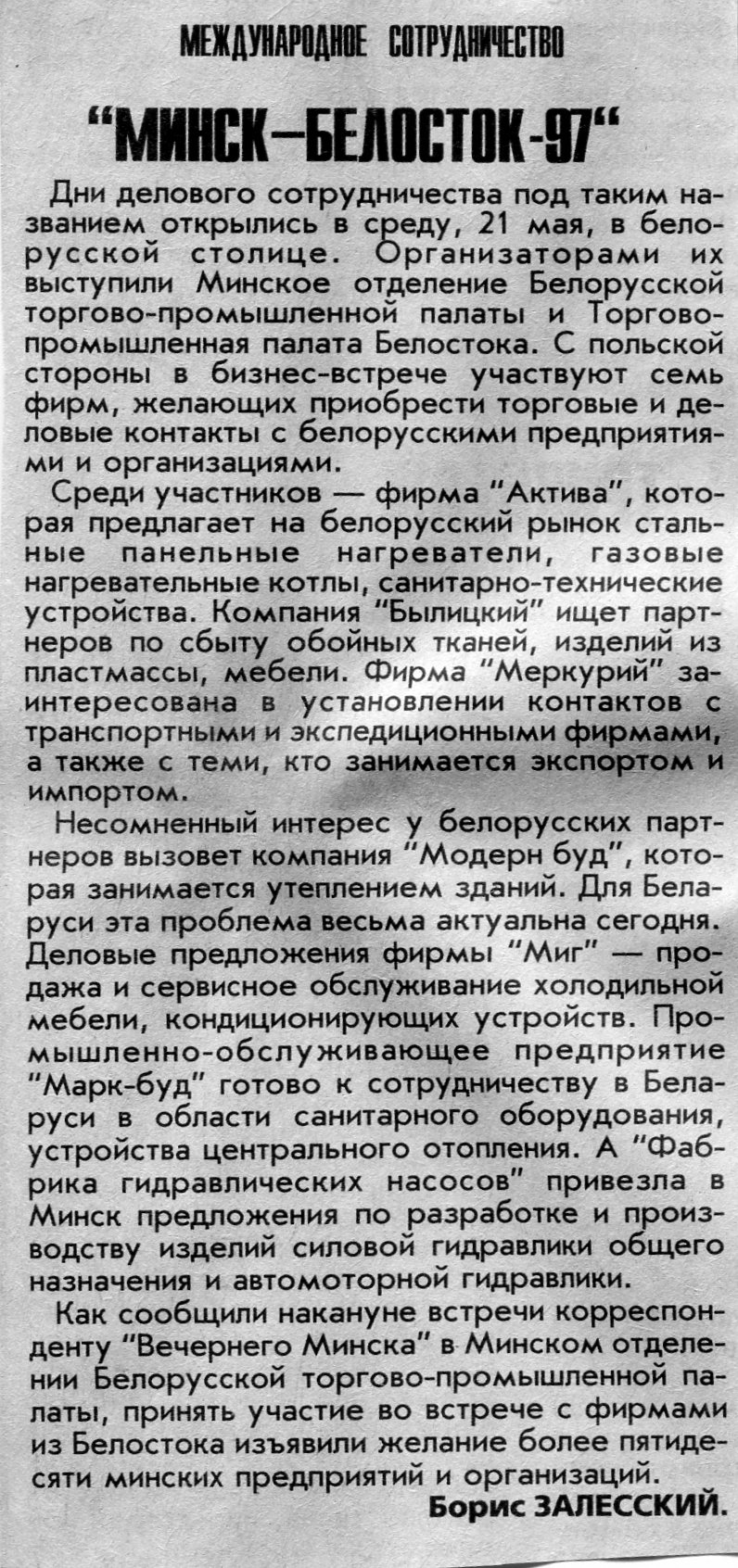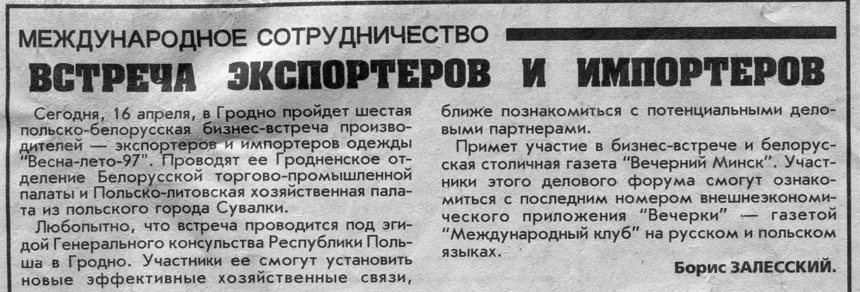 Залесский, Б. Встреча экспортеров и импортеров / Б. Залесский // Вечерний Минск. - 1997. - 16 апр.